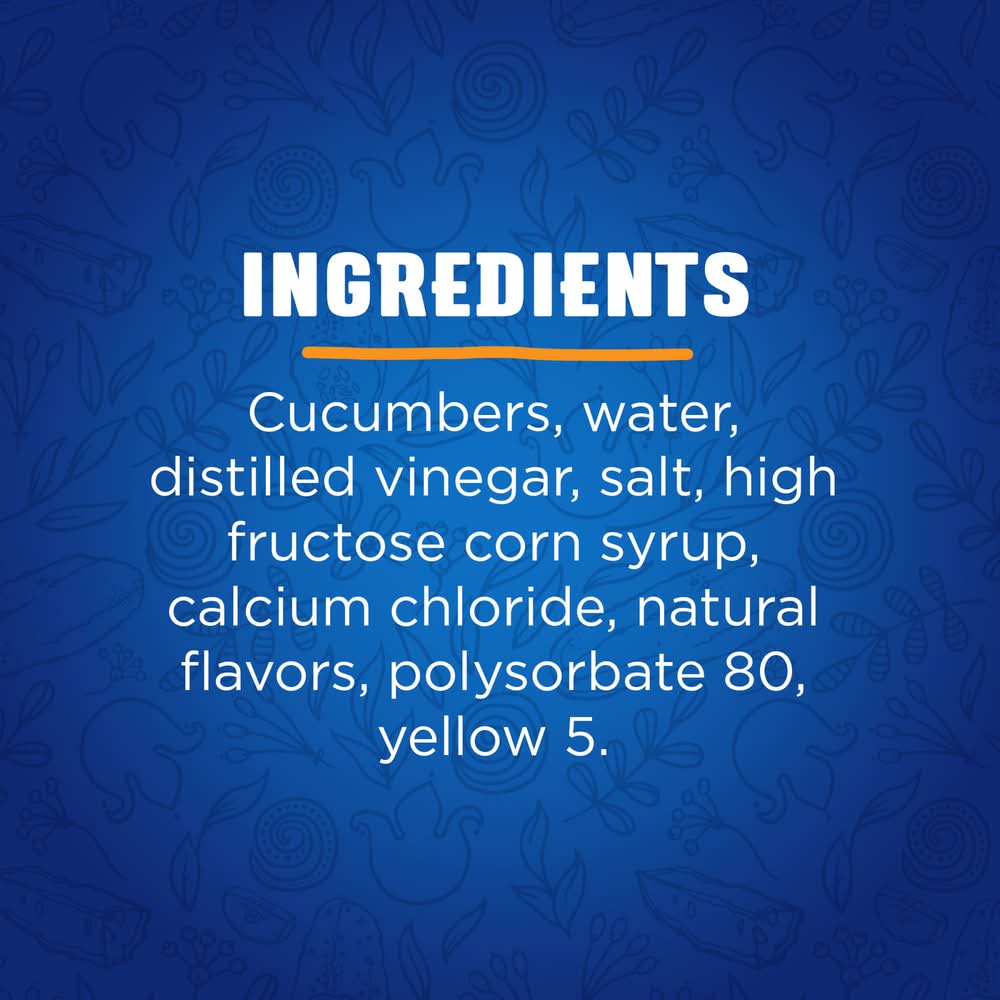 Ingredients: Cucumbers, Water, Distilled Vinegar, Salt, High Fructose Corn Syrup, Calcium Chloride, Polysorbate 80, Natural Flavor, Turmeric Extract (Color)