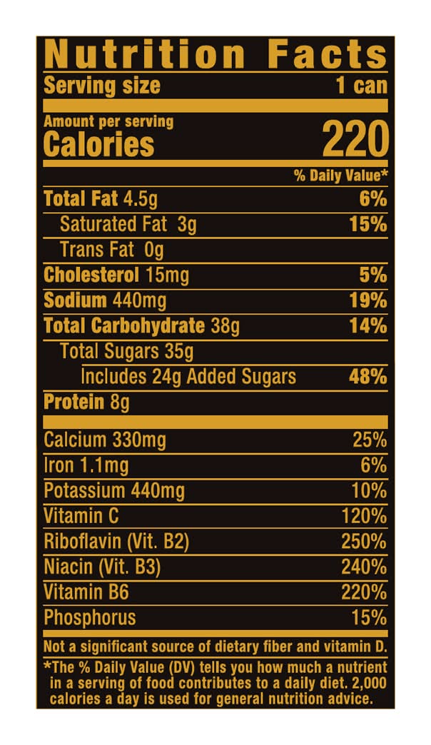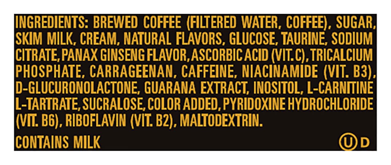 Ingredients: Brewed Coffee (Filtered Water, Coffee) Sugar Skim Milk Cream Natural Flavors Glucose Taurine Sodium Citrate Panax Ginseng Flavor Ascorbic Acid (Vit. C) Tricalcium Phosphate Carrageenan Caffeine Niacinamide (Vit. B3) D-Glucuronolactone Guarana Extract Inositol L-Carnitine L-Tartrate Sucralose Color Added Pyridoxine Hydrochloride (Vit. B6) Riboflavin (Vit. B2) Maltodextrin Contains: Milk