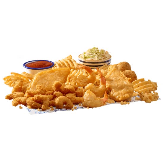 One piece of Alaska pollock and all-white meat chicken, three crispy shrimp — all hand-battered in out signature batter and fried to perfection, and a snack-size serving of popcorn shrimp. Paired with two sides and two hushpuppies.