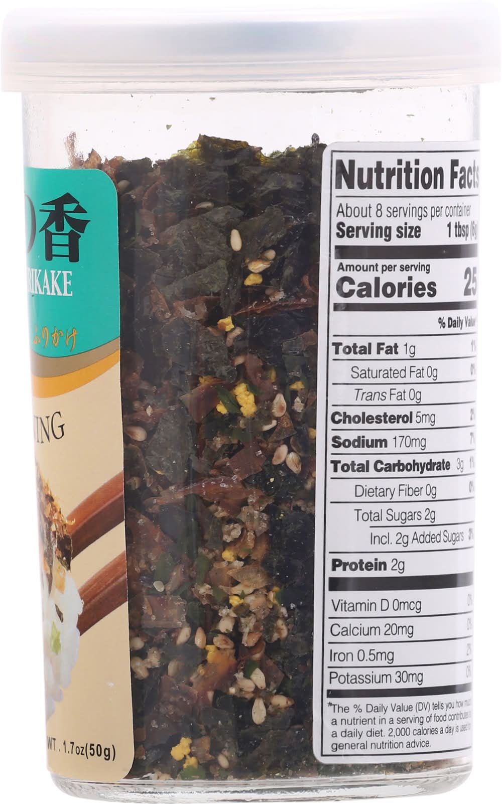 Ingredients: Sesame Seed, Sugar, Bonito, Seaweed, Salt, Corn Starch, Lactose, Maltodextrin, Potato, Egg Yolk Powder, Soy Sauce (Water, Soybean, Wheat, Salt), Cooking Wine (Water, Rice, Salt, Wheat), Sorbitol, Beta Carotene (Color), Disodium Succinate, Malic Acid, Annatto Extract (Color), Disodium Inosinate, Ascorbic Acid Contains: Sesame, Fish, Lactose, Eggs, Soybeans, Wheat