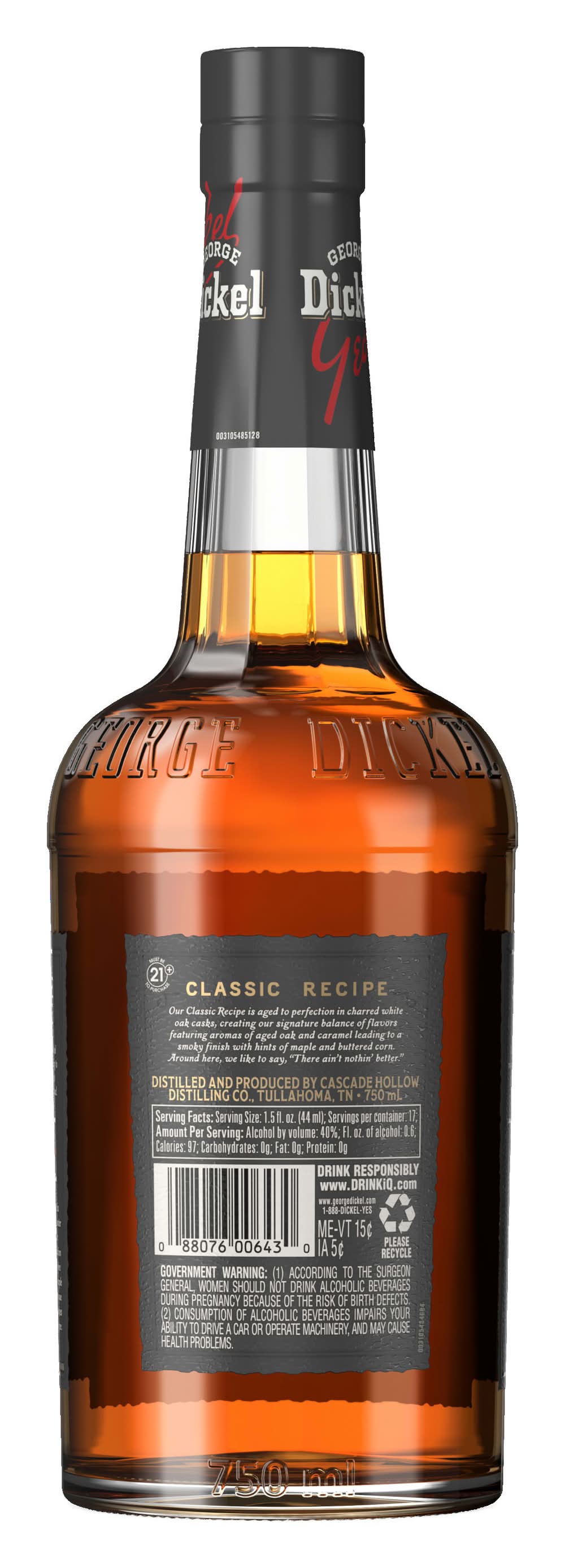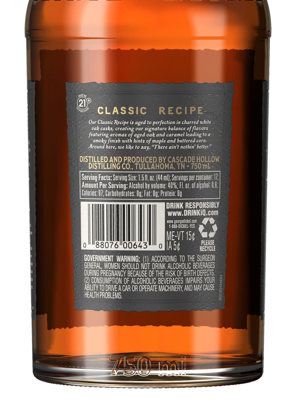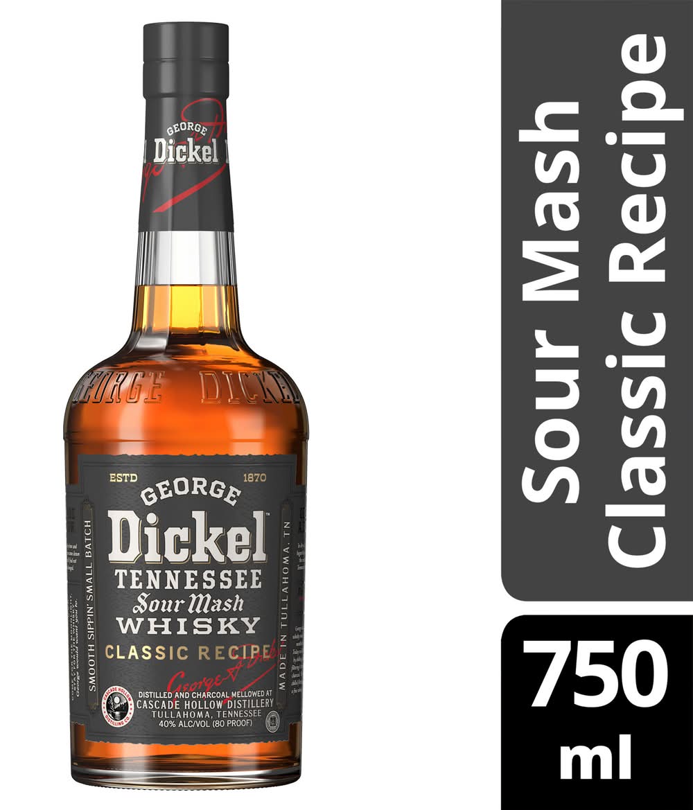 George Dickel Classic Recipe Tennessee Whisky brings depth, range and personality with bold flavors and a remarkably smooth finish. Our 80 proof whisky contains a signature balance of light caramel, maple and wood flavors with a long, smoky finish. Following a chilled charcoal-mellowed style, this process is what makes this specific blend so unique. With its complex flavor and finish, our Classic Recipe Tennessee Whisky is perfect for sipping on its own or adding a delicious kick to your favorite cocktail. Perfect for a Dickel Highball. Includes one 80 proof 750 mL bottle of Classic Recipe Tennessee Whisky. Please drink responsibly. • Alcohol by volume: 40% • Packaging: Reusable