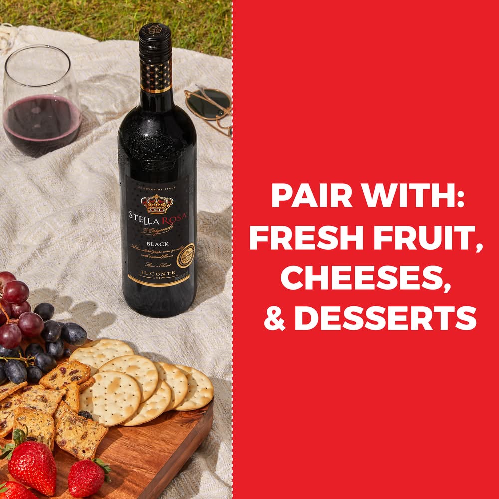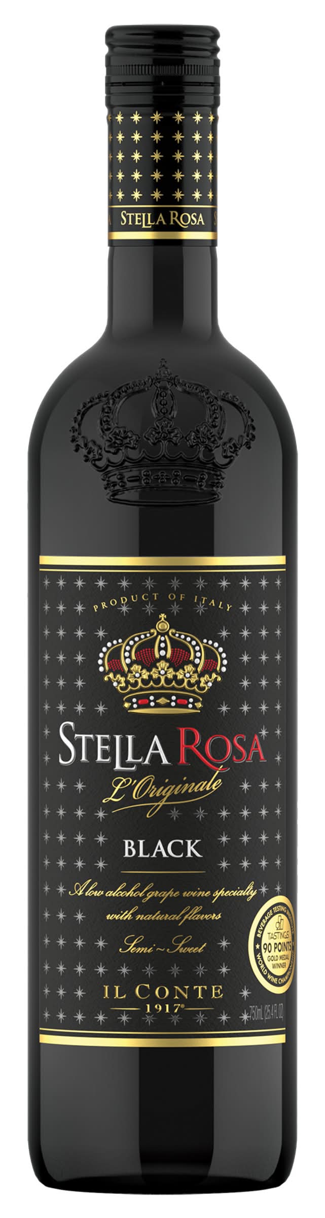 Stella Rosa Black Semi-Sweet Red Wine is a proprietary blend of several red grape varietals including Brachetto. The grapes are harvested, pressed, centrifuged, and then held cold as juice at 28 degrees Fahrenheit. The juice is fermented at various intervals throughout the year allowing the wine to remain fresh and delicate. The Riboli family uses this technique to capture the fresh flavors of blackberry, blueberry, and raspberry. During the fermentation process, the alcohol is created in tandem with the wine’s natural carbonation. Once the desired sweetness is achieved, the wine is centrifuged and bottled. Its natural acidity and low pH strike the perfect balance with the wine’s inherent sweetness. It is not cloying or heavy. Serve chilled by-the-glass, pour over ice, or mix with your favorite spirit for an all-natural, fruit-forward cocktail. • Alcohol by volume: 5% • 2015 • Il Conte Imports, Los Angeles, CA