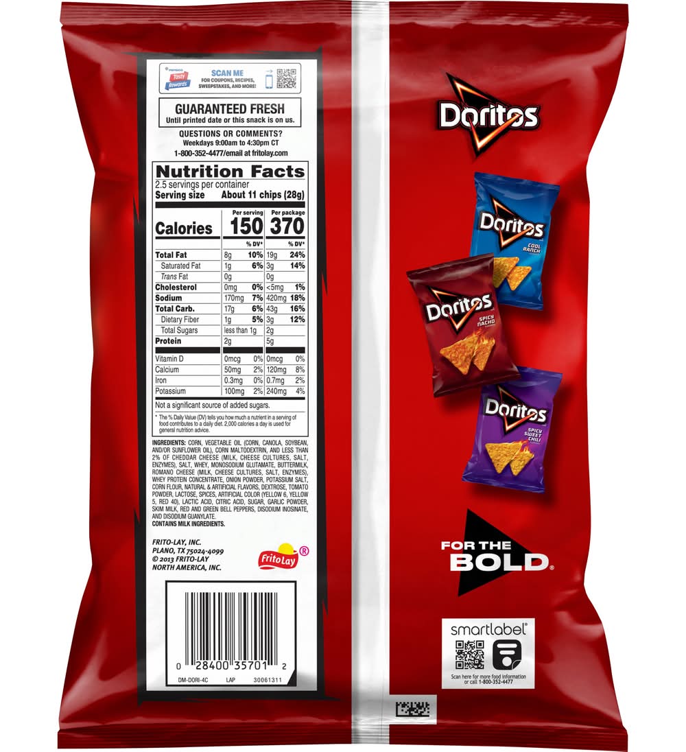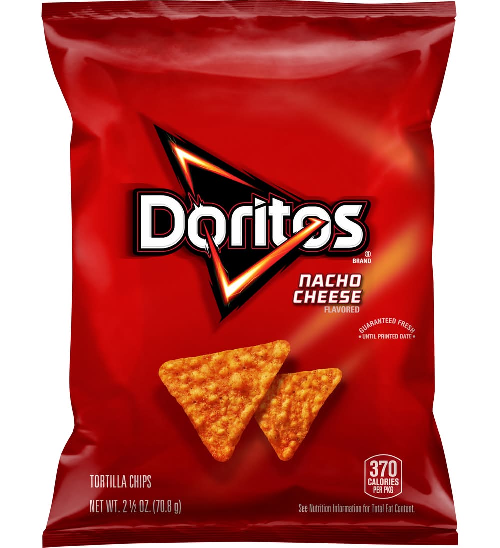 DORITOS tortilla chips with classic nacho cheese flavor. Made of whole corn; flavorings feature real cheddar cheese. Great for Grab & Go Snacking.
