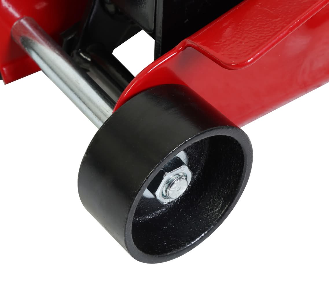 Steel hydraulic block assembly. Includes dust seals to prevent oil contamination. Easy access valve release. Prevent overload: built-in safety overload system prevents jack from overloading; durability: steel construction increases its longevity; easy movement: rear swivel casters for easy jack positioning; carrying handle for easy transportation. Color: Black
