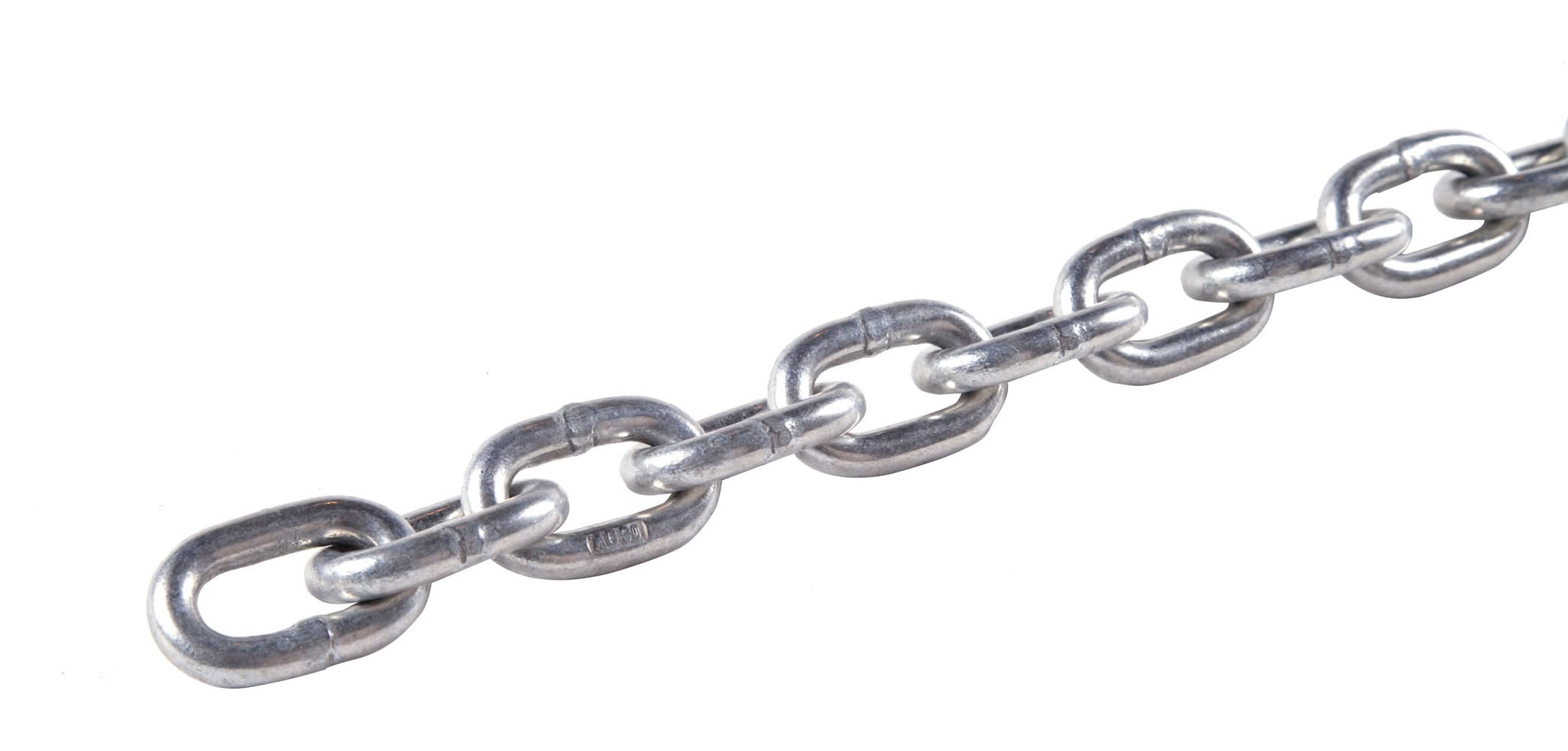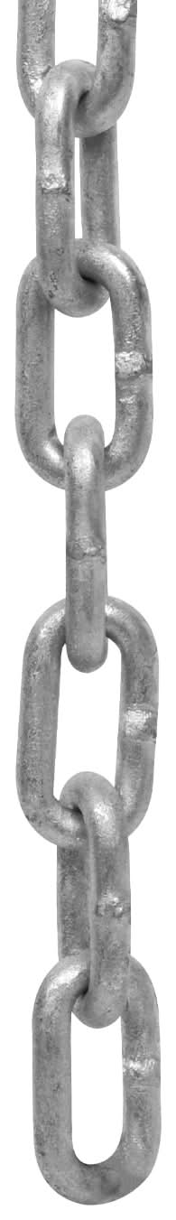 Galvanized finish provides superior corrosion and abrasion resistance. Safe working load 800lbs(365kg), max breaking strength 3200lbs(1460kg). RELIABILT 3/16-in galvanized proof coil chain (by-the-foot) is a weld link chain with high load capacity. Grade 30 chain is good for guard and barrier, animal tie-out, tailgate, farm equipments, lashing cargo, tie down and other general indoor and outdoor purpose. Galvanized finish provides superior corrosion and abrasion resistance,3/16in chain sold by the foot for a maximum of 100 feet per pail. Warning: do not use for overhead lifting; do not exceed safe working load. Color: Silver
