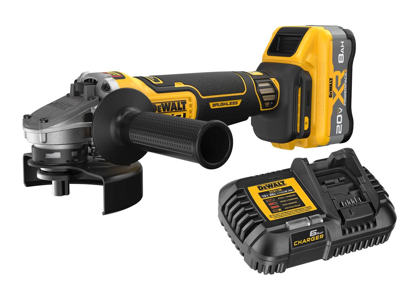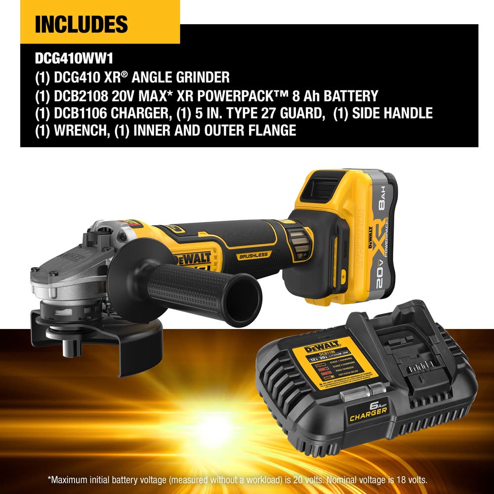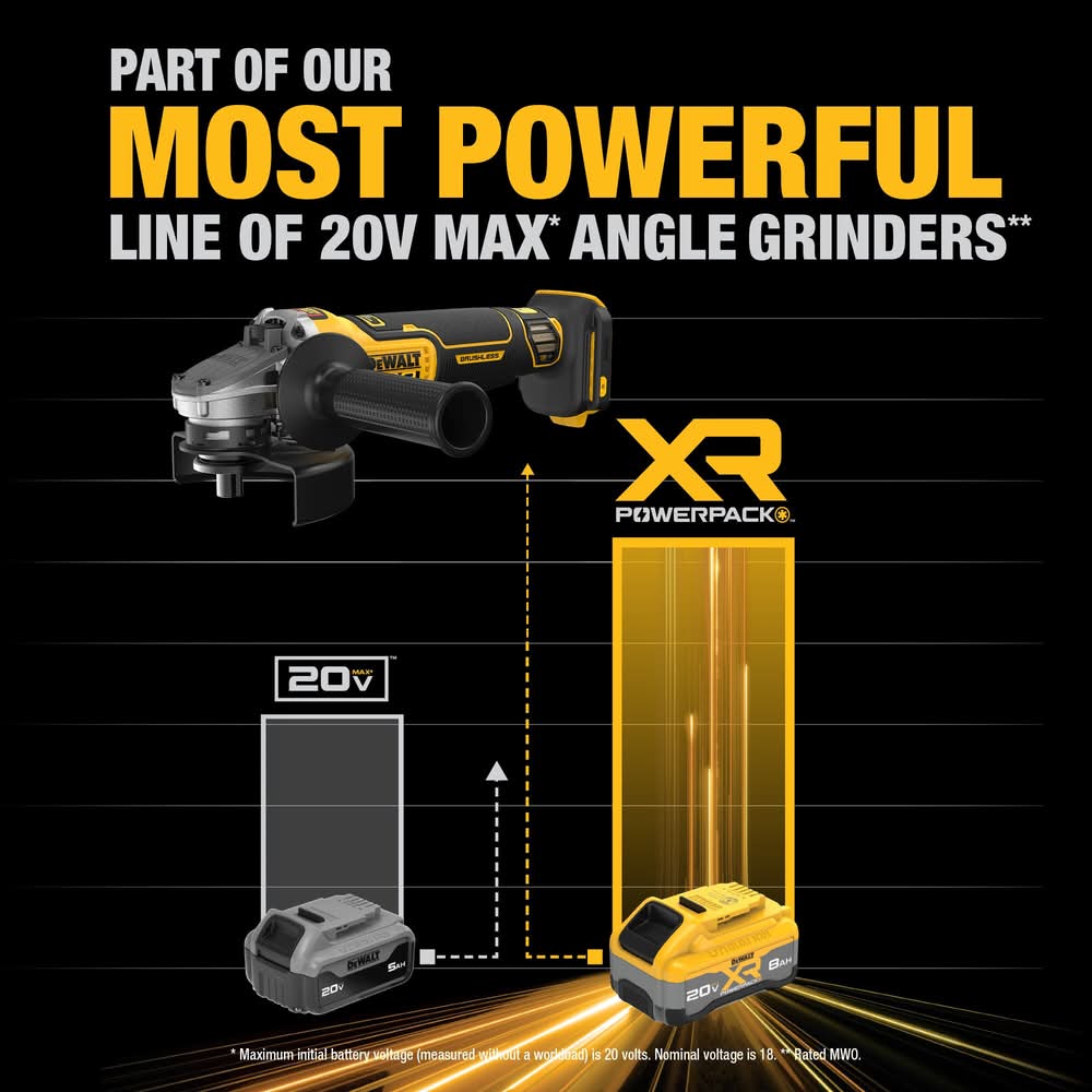 Part of our most powerful line of 20V MAX* angle grinders**. Help maximize control – equipped with the anti-rotation system that senses the rotational motion of the tool and shuts it down if the motion is excessive. Powerful performance - take on tough jobs with a brushless motor engineered to deliver up to 1,590 MWO and 9,000 RPM (no load). Simplify asset management - this TOOL CONNECT™ chip ready (chip sold separately) TOOL CONNECT™s with the TOOL CONNECT™ site manager app to help you track and manage assets. Wireless tool control system - use the wireless tool control system featuring on/off capability when paired with a compatible DEWALT® dust extractor (sold separately). Part of our best performing line of 20V MAX** power tools – innovative power tools designed to deliver certainty for the world’s toughest pros. Disclaimer: **Rated MWO. For CA Residents Only: WARNING: This product can expose you to chemicals including Lead which are known to the State of California to cause cancer and birth defects or other reproductive harm. For more information go to www.P65Warnings.ca.gov. Color: Yellow