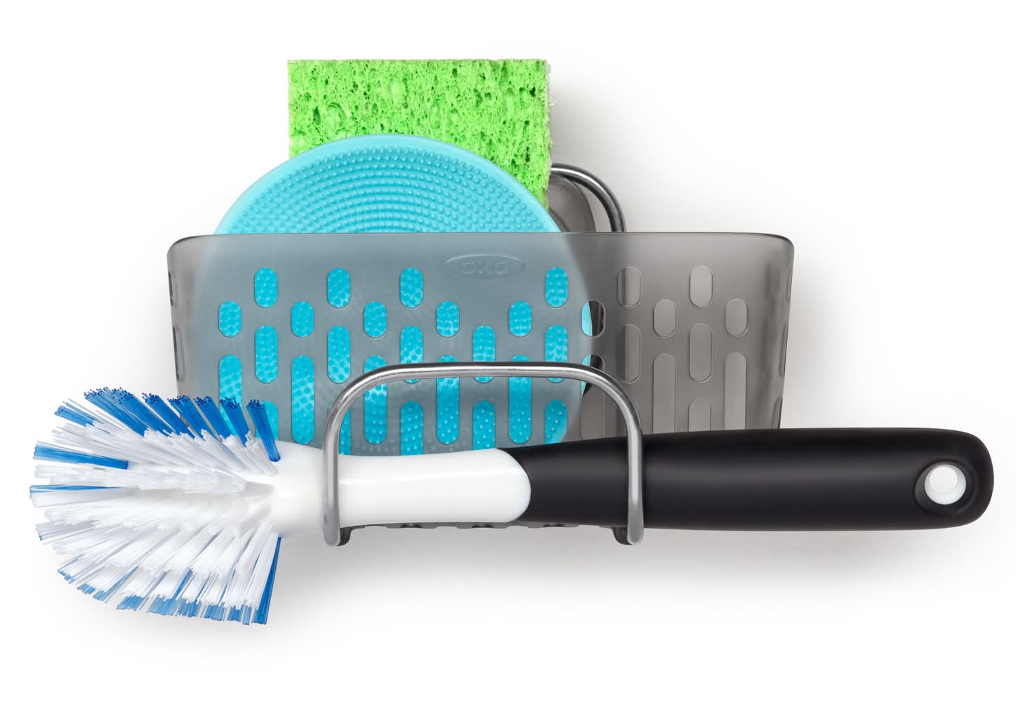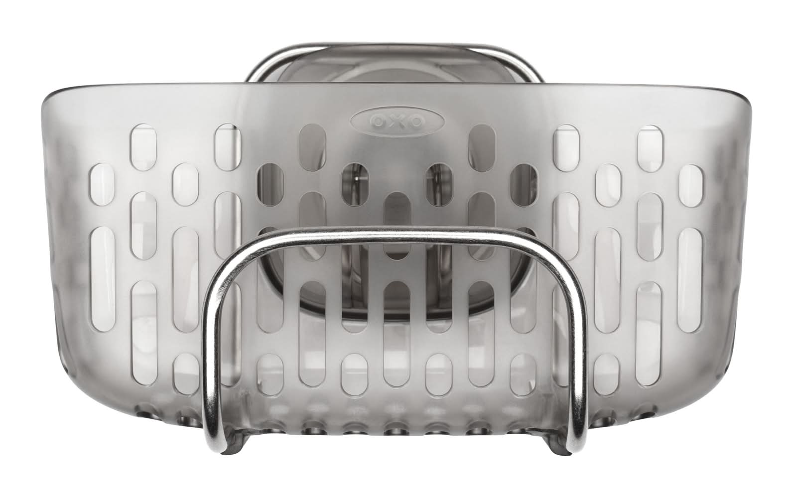 The OXO Good Grips StrongHold™ Suction Sink Caddy secures inside sinks to keep counters neat. Phthalate-free StrongHold™ suction cup activates with a push of a lever. Large-capacity basket holds oversized sponges, dish brushes, steel wool, scrubbers and other dishwashing tools. Stainless steel front hook provides easy access to your favorite sponge or brush. Removable basket comes off suction base to make room for washing large items like pots, pans, serving dishes and more. Drainage slots for quick drying. Dishwasher safe. Color: Gray