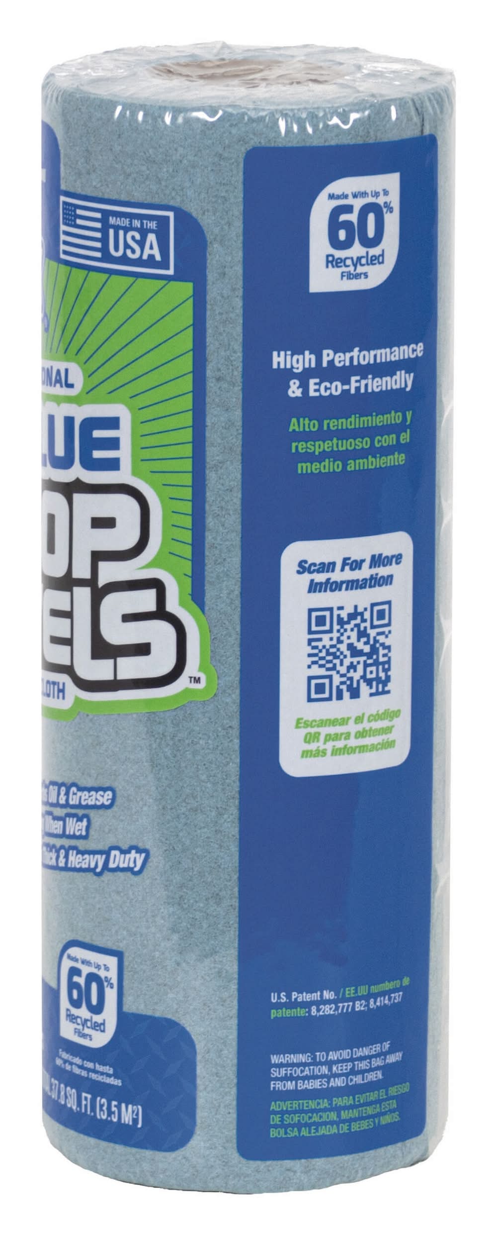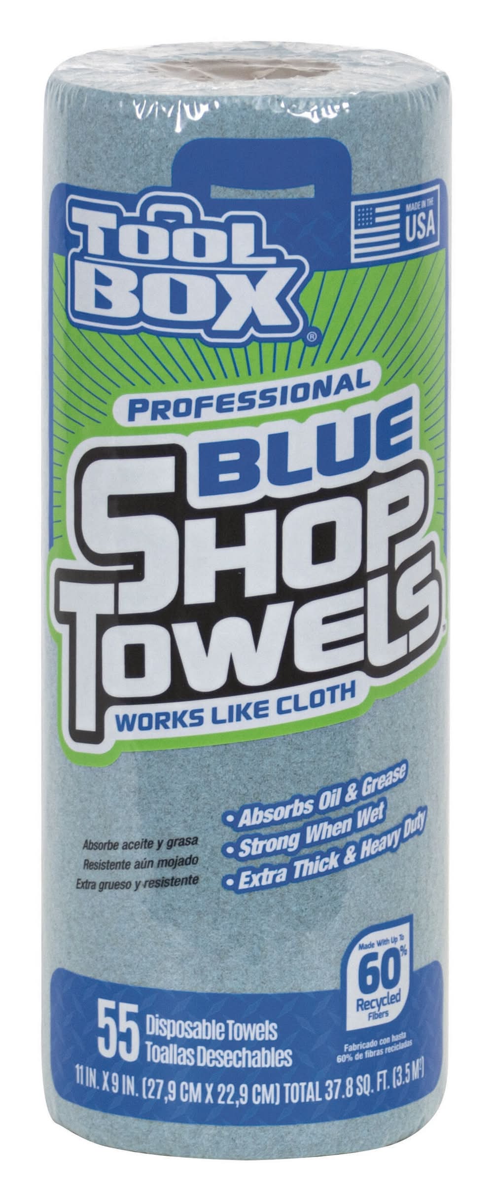 Works like cloth. Soft on hands and face. Strong and absorbent. Won't fall apart when wet. Handles tough tasks. Fits on a standard towel holder for easy dispensing. Shop towels contain 60% post-consumer recycled fibers. Meets the EPA Comprehensive Procurement Guidelines. Sheet Size: 11" x 9". Color: Blue