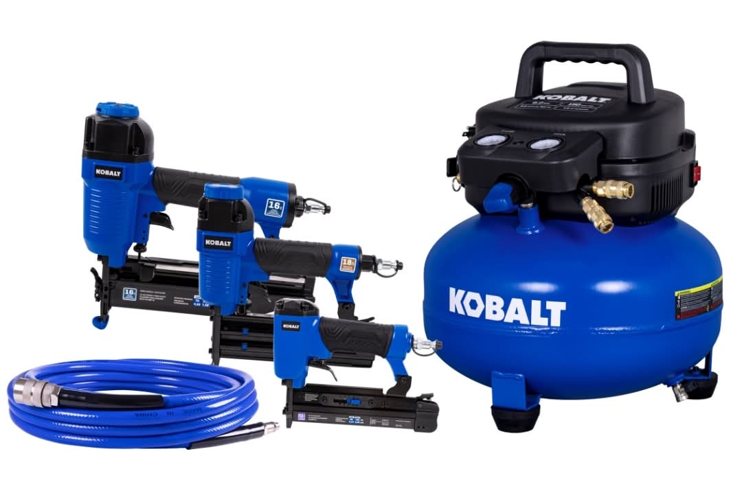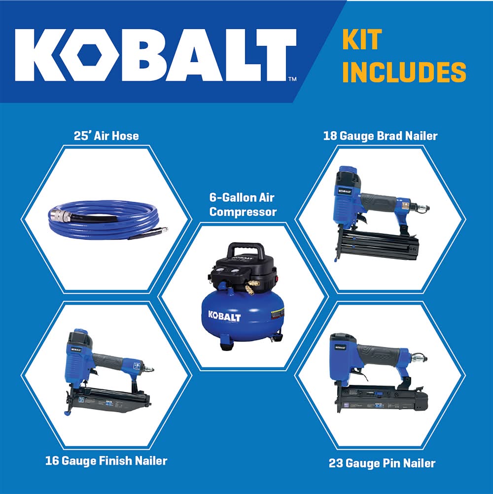 Powerful oil-free universal maintenance-free motor and easy to start in low voltage with an extension cord.. Includes: 6-Gallon Air Compressor, 16 Gauge Finish Nailer, 18 Gauge Brad Nailer, 23 Gauge Pin Nailer, and 25’ Air Hose.. Two gauges provide pressure indicators for both tank and tool to be used. 1/4-turn ball valve makes it easy to drain the tank anytime without blocking. Two durable quick couplers allow two tools to be used simultaneously. 18 GA Brad Nailer: For finishing tasks such as trim work, cabinetry, and small baseboard installations.. 16 GA Finish Nailer: For various tasks, including crown molding, sizable baseboards, exterior trim, and door jams.. 23 GA Pin Nailer: For attaching thin moldings, veneers, or delicate trims.. 25’ Air Hose: Extra-long air hose for added convenience and length for a variety of projects..