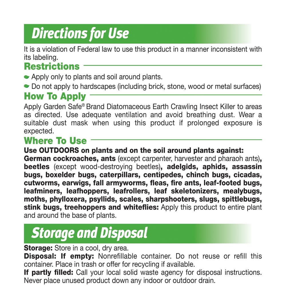 Contains DIATOMACEOUS EARTH: apply this fine dust with a hand duster or squeeze bottle. Controls crawling insects: kills cockroaches, ants, silverfish, beetles and other listed insects. Kills by contact: kills listed insects by contact. Use OUTDOORS: Apply a thin layer of dust to areas where crawling insects live and hide. Use as Needed: Dust insects directly if possible; reapply when dust is no longer present and if insects are observed.