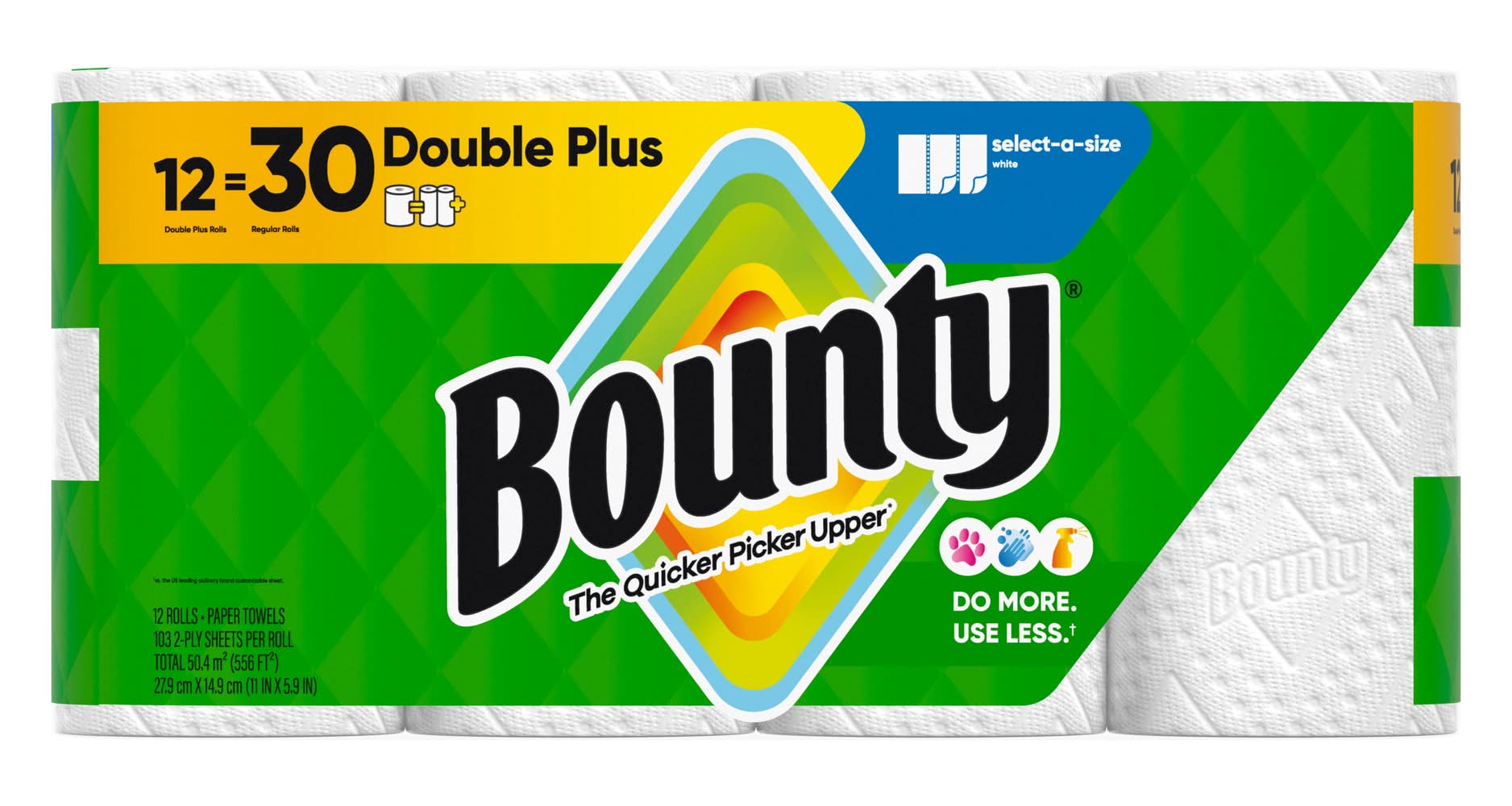 Pack contPack contains 12 Double Plus Rolls of white Bounty Select-A-Size Paper Towels. 12 Double Plus Rolls = 30 Regular Rolls. Select-A-Size sheets help you customize how much to use for each task. Picks up spills and messes quicker vs leading ordinary brand. Color: White
