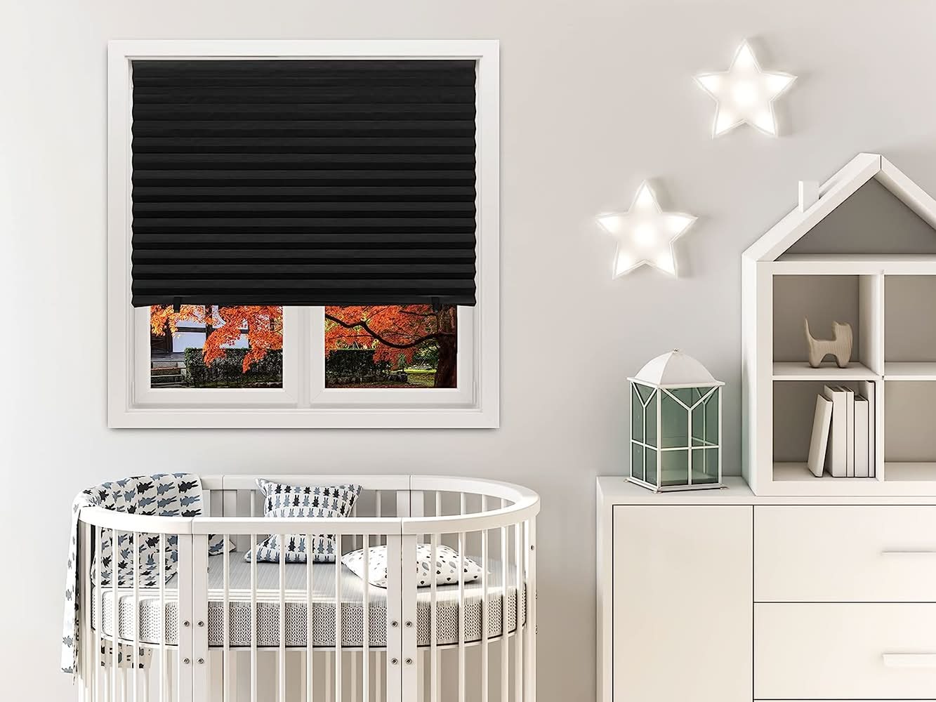 Trim at home for the perfect fit inside or outside your window frame, then install in seconds without a drill, screws, or brackets — No Tools needed. Block 99% of light for complete privacy, light control and UV protection for bedrooms, children’s rooms and movie rooms. No cords for a clean look and child safety — use included clips to raise and lower shade. Made in the USA of durable paper that will not yellow or crack from sun exposure. Your No Tools window covering solution for over 30 years — works as a stand-alone solution, or easily layer behind existing window treatments. Use Location: Indoor Color: Black
