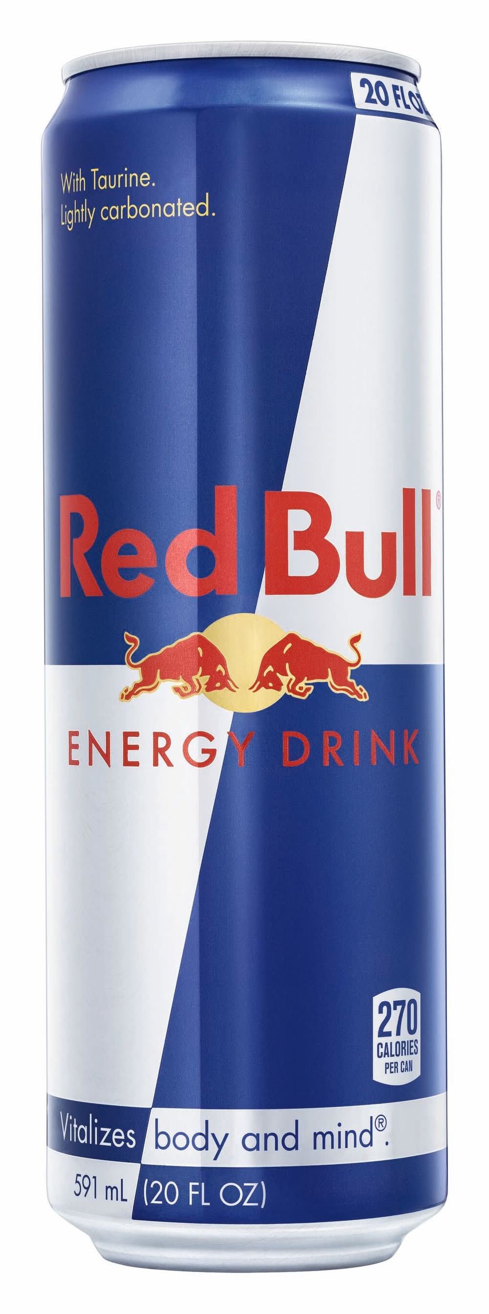 One 20 fl oz can of Red Bull Energy Drink. Red Bull’s signature formula features high-quality ingredients, including caffeine, taurine, B-group vitamins, real sugar and water. Each 20 fl oz can of Red Bull Energy Drink contains 189 mg of caffeine per serving, about the same amount as in an equal serving of home-brewed cup of coffee. Packaging: Reusable