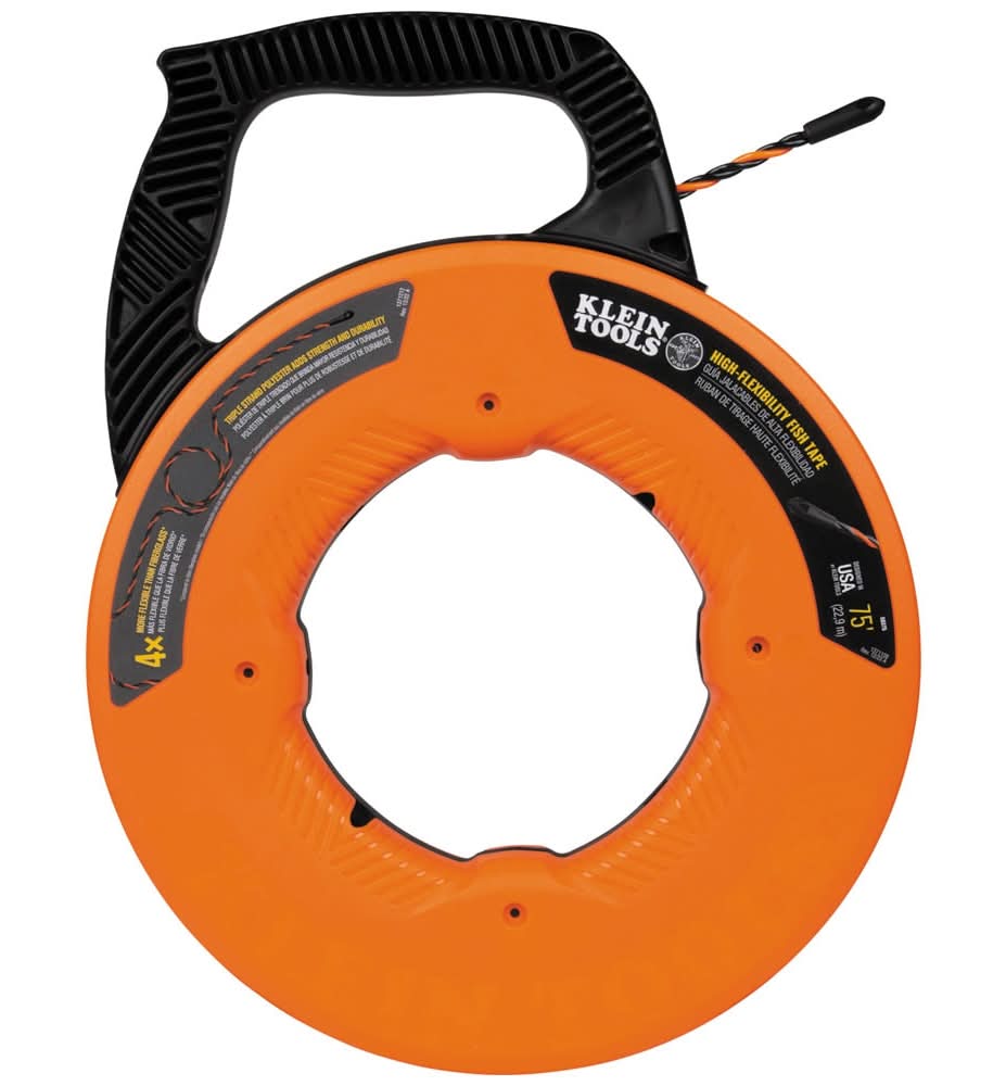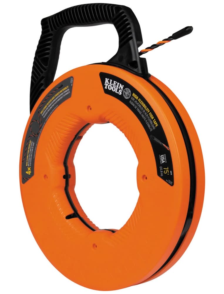 75-Foot (22.9 m) High Flex Polyester Fish Tape is the perfect combination of flexibility for easy navigation and strength to withstand difficult pulls. Triple strand polyester fish tape is 4 times more flexible than fiberglass and 8 times more flexible than steel. Polyester material delivers ultimate flexibility to easily glide around difficult corners or joints. Triple strand braided tape design creates rigidity to hold shape during payout; improves tape strength and durability to tackle more difficult pulls compared to fiberglass. Overall lightweight design and optimized feed angle produce a smooth pay-out and retraction, reducing effort and fatigue. Bright orange strand woven into triple strand tape provides better visibility and locating of the tape in low-light. Polypropylene case and handle offer high impact resistance. For CA Residents Only: WARNING: This product can expose you to chemicals including Lead which are known to the State of California to cause cancer and birth defects or other reproductive harm. For more information go to www.P65Warnings.ca.gov.