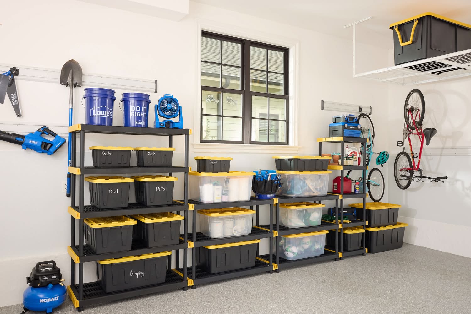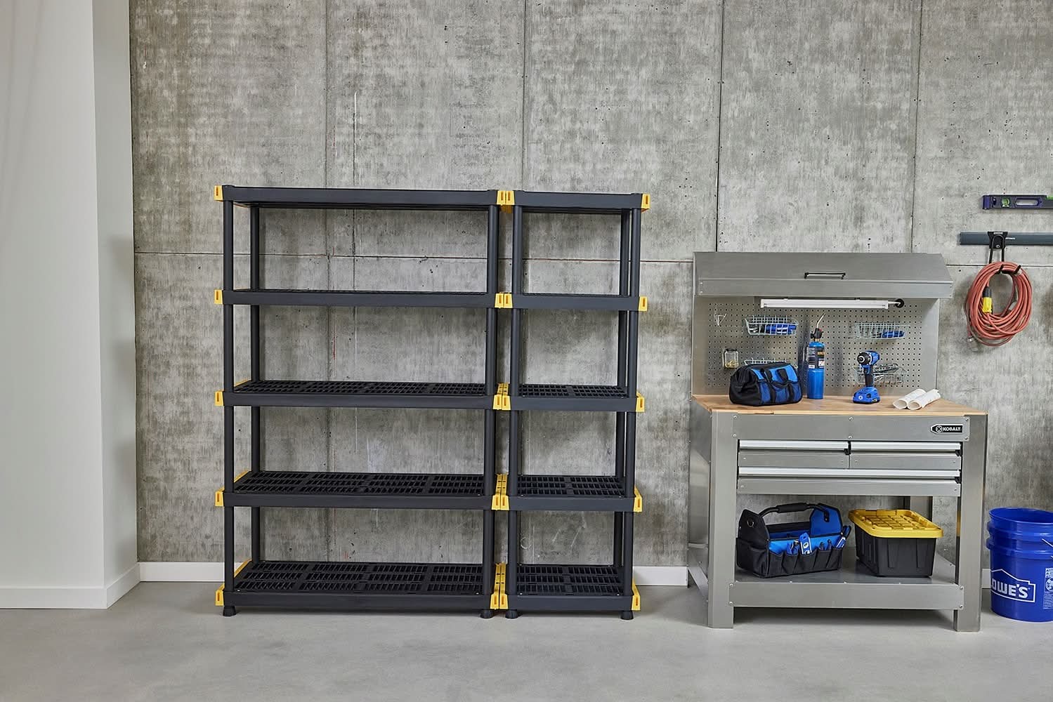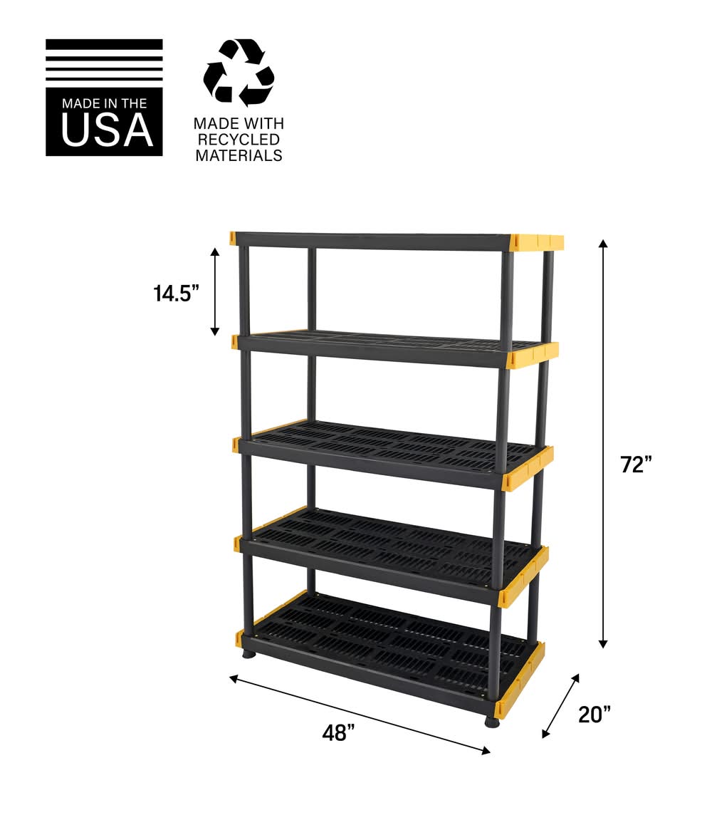 Heavy Duty: 200 LB weight capacity per shelf when utilizing the included mounting brackets. Interlocking: Customize your shelf with provided “T” connectors to interlock multiple units together. Quick Assembly: This shelf can be built easily and quickly, allowing you to spend less time building, and more time organizing. Durable plastic construction with ventilated utility shelves that resists moisture. Adjustable leveling feet to compensate for uneven surfaces. Lightweight compared to metal shelving for easy transportation. Dimensions: 20” D x 48“ W x 72” H | 42” W between poles | 14.5” H between shelves. Made in the USA. Made with 45% recycled contents. Use Location: Indoor Color: Black
