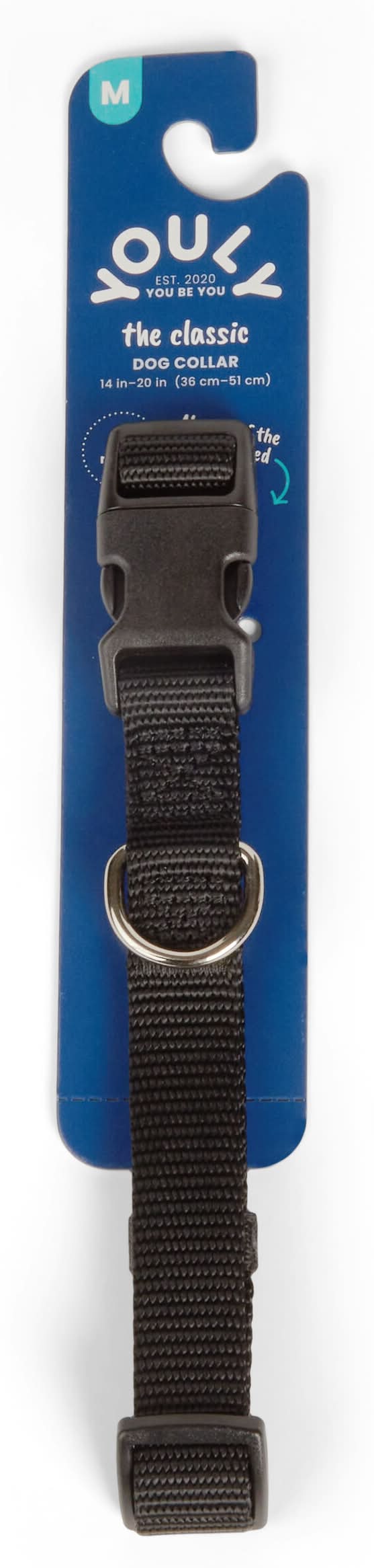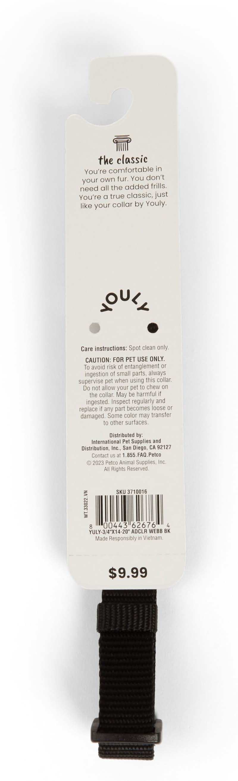 Adjustable Collar from Youly. Adjustable length allows for custom fit. Mix and match with other Youly styles. Nylon is classic choice. Plastic snap buckle offers a secure and durable closure. Matching leash sold separately. Use Location: Indoor/Outdoor Color: Black