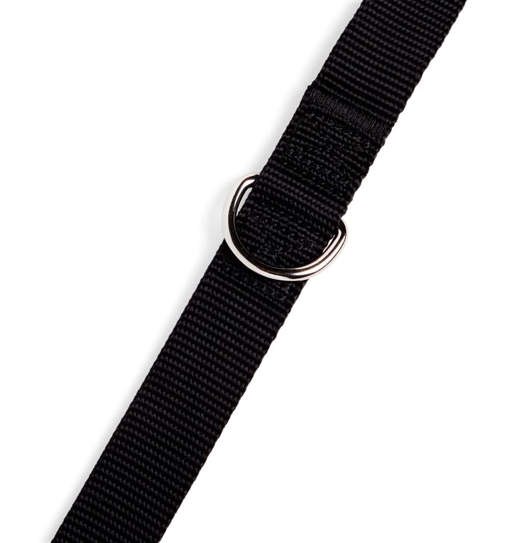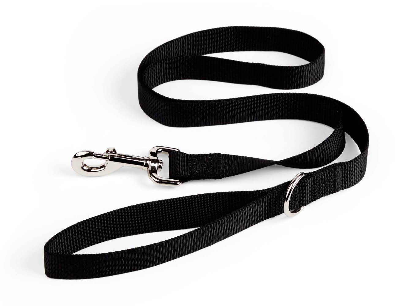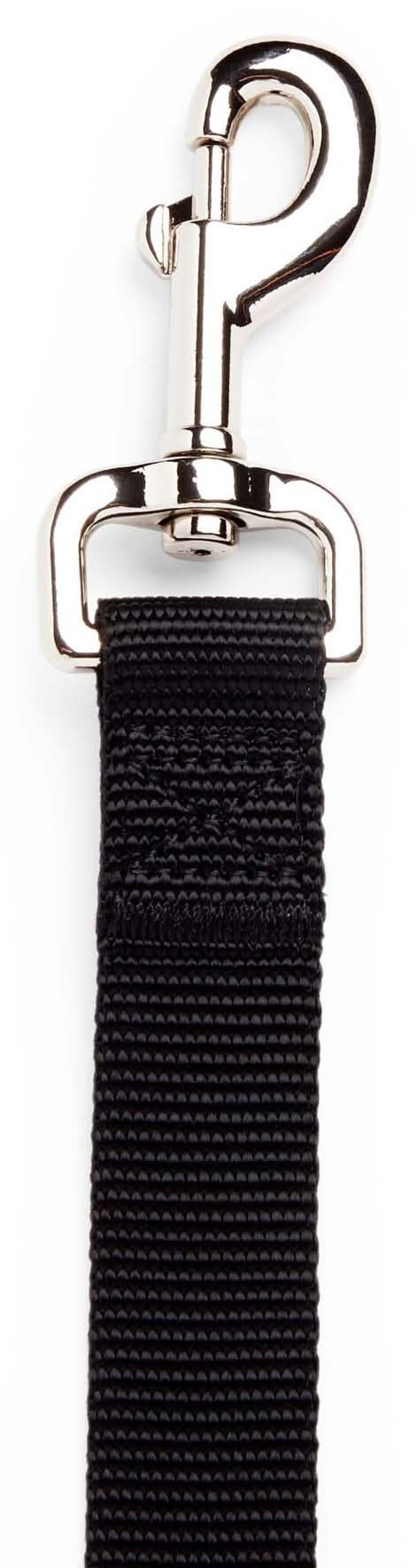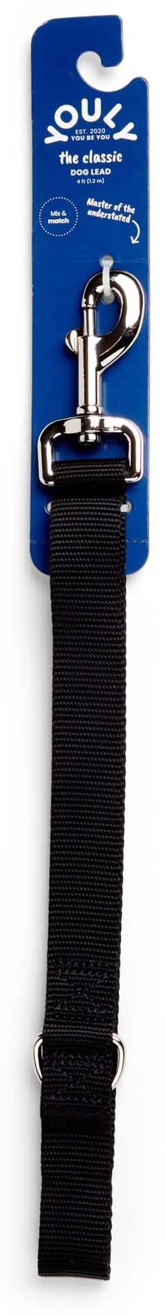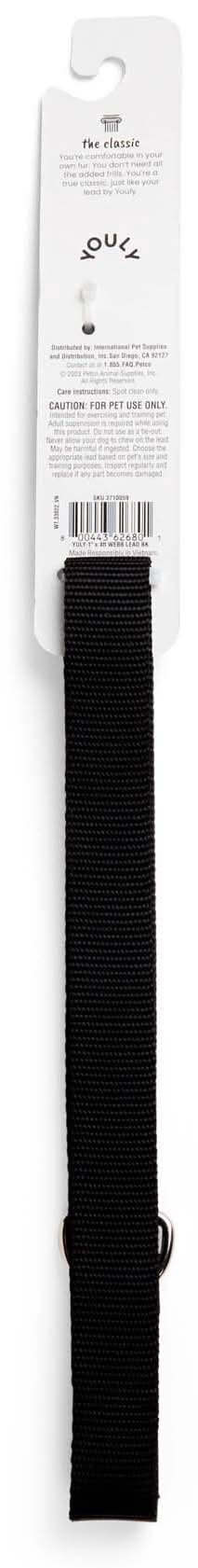 Leash from Youly. Durable nylon construction. Metal swivel snap to clip onto any dog collar or harness. Metal D-ring for attaching accessories such as waste bag dispensers or beacons. Silver-tone hardware. Matching collar and harness sold separately. Use Location: Outdoor Color: Black