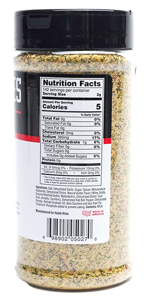 A unique mix of our Garlic Jalapeño Rub and Roasted Garlic Butter Blend, our Garlic Butter Rub is full of savory flavors and spices that are a key part of some of our best recipes Add it to steaks, chicken, seafood, veggies, popcorn, and eggs — the possibilities are endless. Available in a 16oz by volume bottle, 10oz by weight. Salt, sugar, dehydrated garlic, dehydrated onion, spices, monosodium glutamate, butter flavor (maltodextrin, modified butter oil, dehydrated butter, guar gum, sodium bicarbonate, annatto and turmeric), dehydrated red bell pepper, dehydrated parsley, refined soybean oil, beta carotene and less than 2% tricalcium phosphate added to prevent caking..
