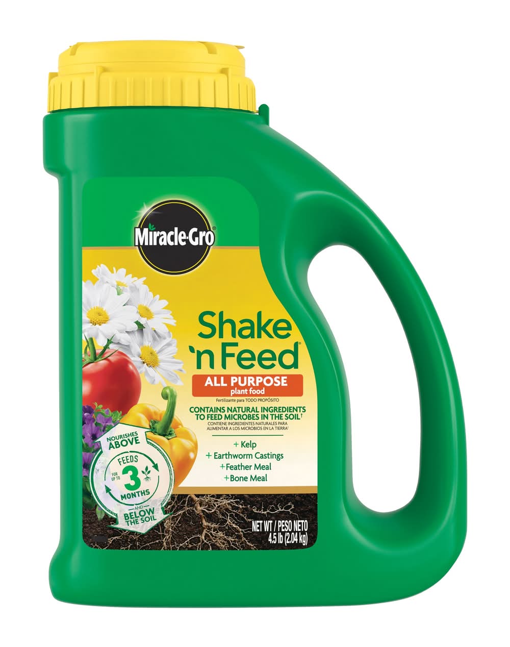 Feeds plants for up to 3 months, and nourishes above and below the soil. Contains vital micronutrients to grow stronger, vibrant and more productive plants (vs unfed plants). Use with container or in-ground plants and most plant types. Apply this garden product evenly onto the soil and work into the top 1-3 inches of soil for in-ground plants, or lightly work into the soil of established container plants; water to start feeding. Reapply Miracle-Gro® Shake 'N Feed® All Purpose Plant Food every 3 months and water regularly for a beautiful garden all season long. Contains natural ingredients that help feed and nourish above and below the soil.