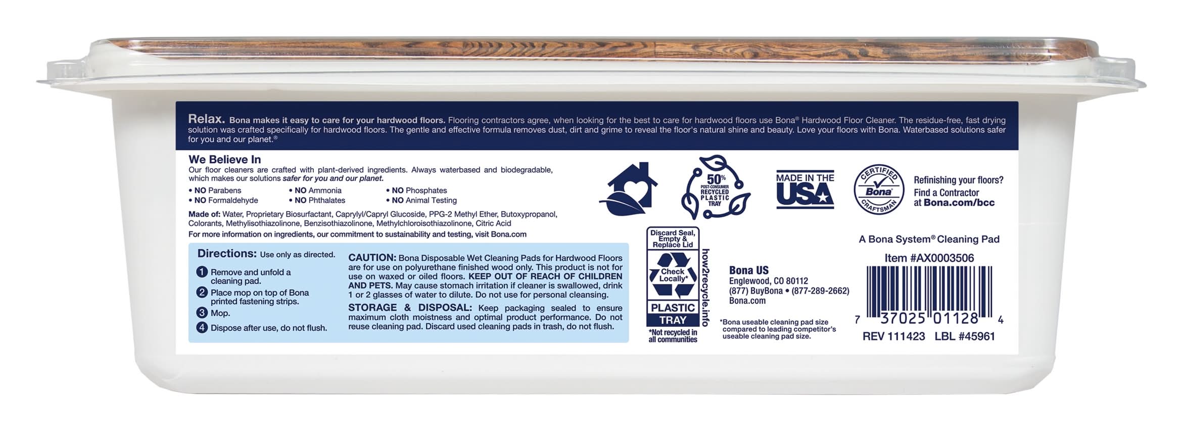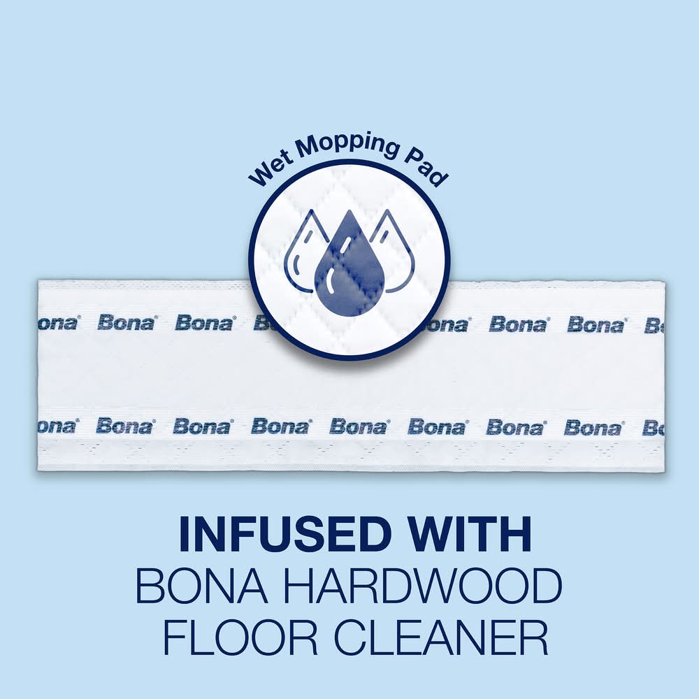 QUICK AND EASY CLEANING: Just attach, clean, and toss. INFUSED WITH BONA CLEANER: Same great Bona cleaner in a convenient wet mopping pad. GREAT FOR SPOT AND PET CLEANING: Use for a quick touch-up or those unpleasant pet messes. CLEANER INGREDIENTS: Always waterbased and biodegradable and formulated without formaldehyde, ammonia, petroleum, phosphates, phthalates and parabens. XL PAD SIZE: Clean quicker with a 90% larger pad than other leading pads. SAFE FOR HARDWOOD FLOORS: Protect your floor from discoloration and harm with our pH neutral formulation which is safe for all unwaxed, unoiled, polyurethane finished wood floors. Fits all Bona branded mops. Packaging may vary. Use Location: Indoor Packaging: Reusable