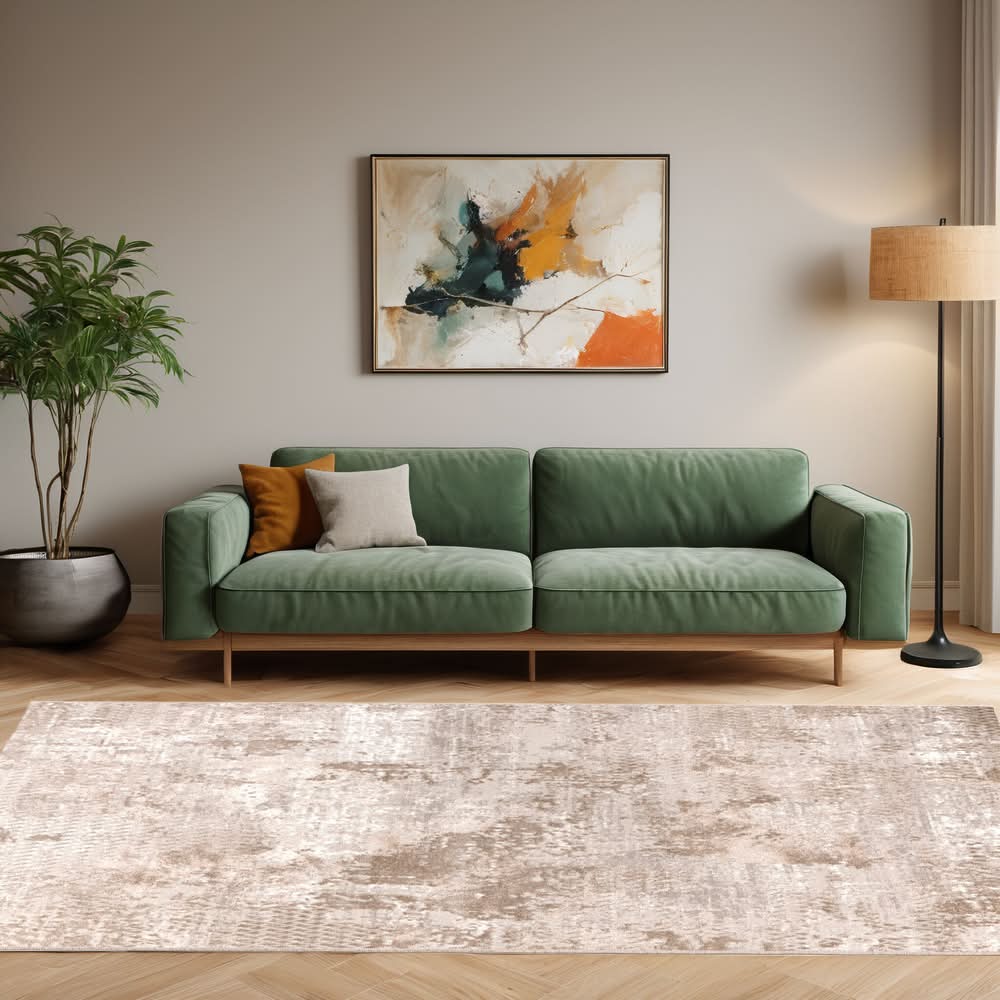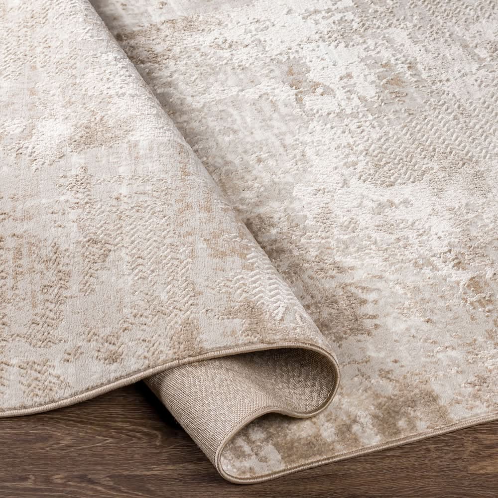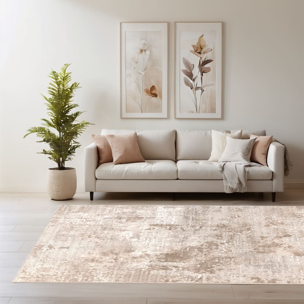 Polyester-Polypropylene- stain-resistant, making it perfect for high traffic areas. Distressed abstract pattern in taupe and ivory adds modern sophistication. 0.39 in pile height provides a comfortable underfoot feel and easy maintenance. Stain- and fade-resistant fibers maintain vibrant color and long-lasting beauty. This product is OKEO-TEX® STANDARD 100 certified, ensuring it has passed safety tests for harmful chemical substances.. A rug pad, sold separately, safeguards the rug's lifespan and the flooring underneath.. For a lasting fresh look, perform spot cleaning with a mild detergent and maintain regular vacuuming as part of its care routine.. 8-ft x 10-ft area rug is perfect for living rooms,bedrooms and dining rooms. Comes with a one-year limited warranty. Use Location: Indoor Color: Beige