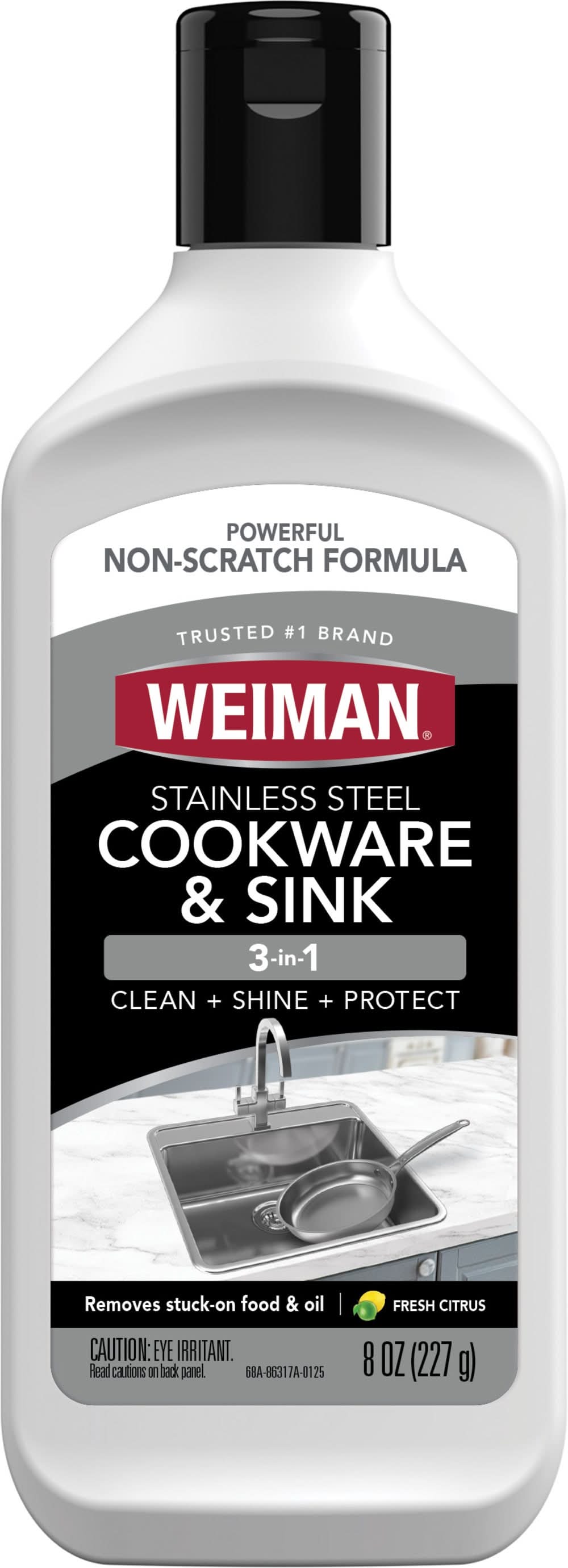 Weiman Stainless Steel Cleaner and Polish products do NOT contain tetrachloroethylene (PCE). Eliminates stains, rust, lime, tarnish, soap scum and hard water deposits. Removes baked-on cooking oil from stainless steel cookware. Cleans and restores to a brilliant, sparkly shine. Specially formulated for stainless steel sinks and cookware. Gentle, semi-abrasive formula cleans up tough messes without scratching. Removes hardened, stuck-on food residue from stainless steel sinks. Use Location: Indoor