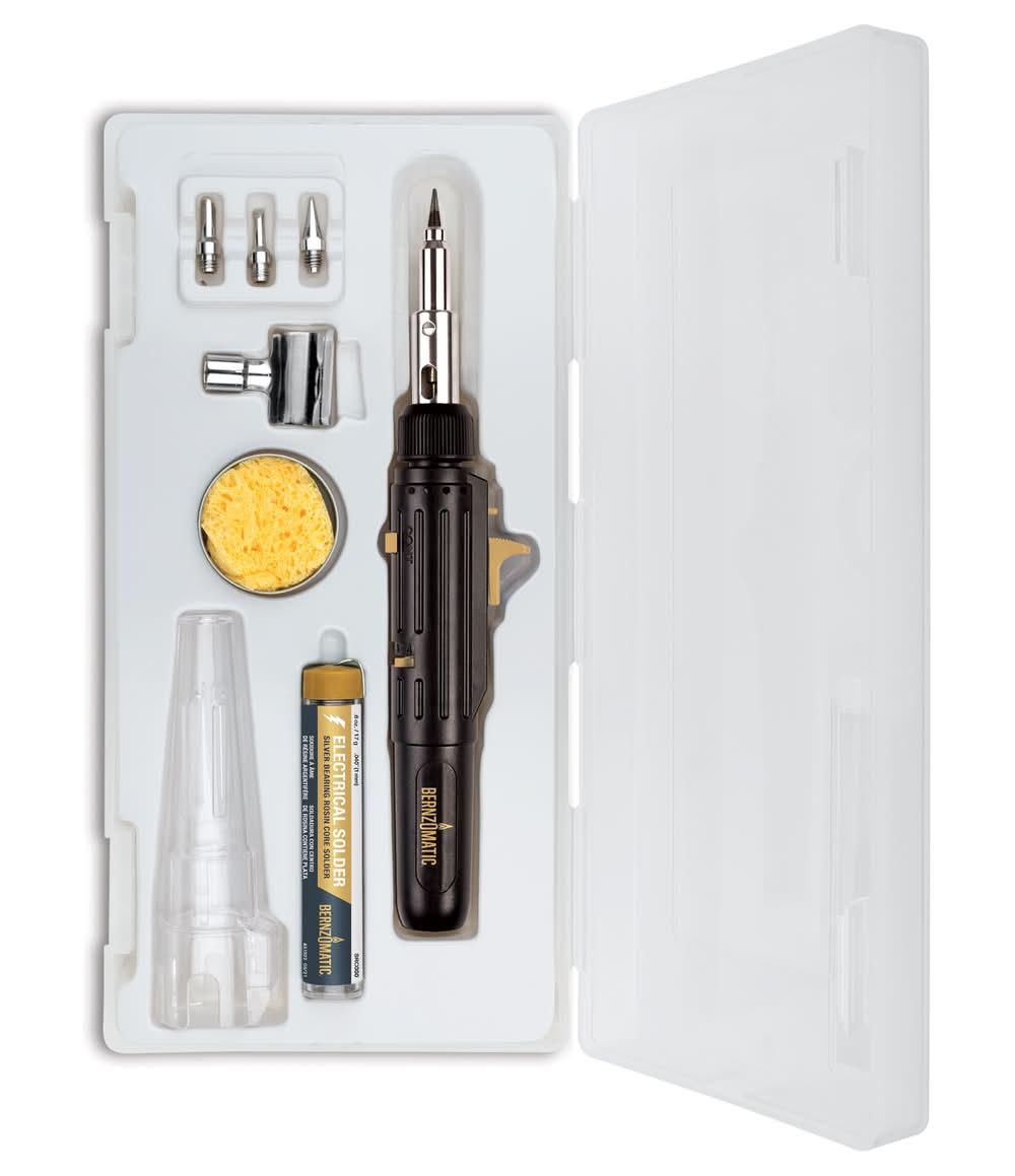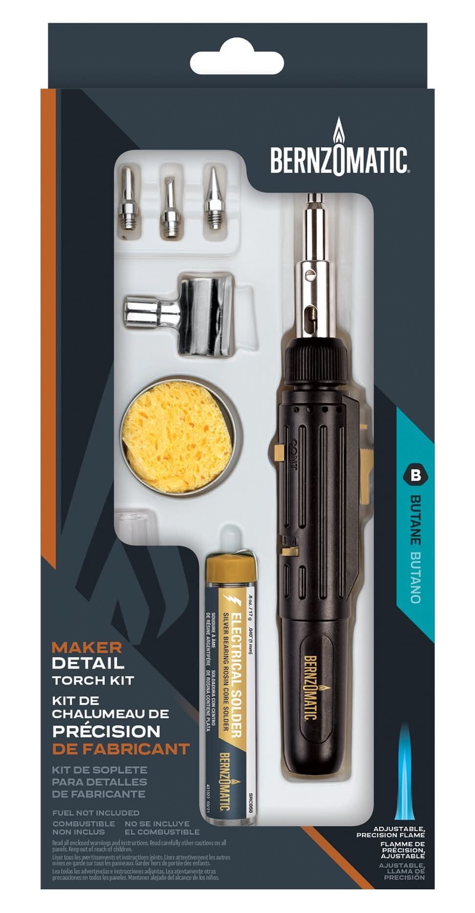 Kit includes micro torch with seven interchangeable settings, cleaning sponge, 0.6 oz electrical solder, and storage case. Convenient ignition switch easily ignites and extinguishes flame. For use with butane fuel, such as the Bernzomatic 5.5 oz butane cylinder. Pinpoint flame for detailed work. Adjustable flame control easily sizes flame for different applications. Continuous flame lock keeps torch lit. CPSC approved child resistant ignition. Limited 3-year warranty. For CA Residents Only: WARNING: This product can expose you to chemicals including Lead which are known to the State of California to cause cancer and birth defects or other reproductive harm. For more information go to www.P65Warnings.ca.gov.