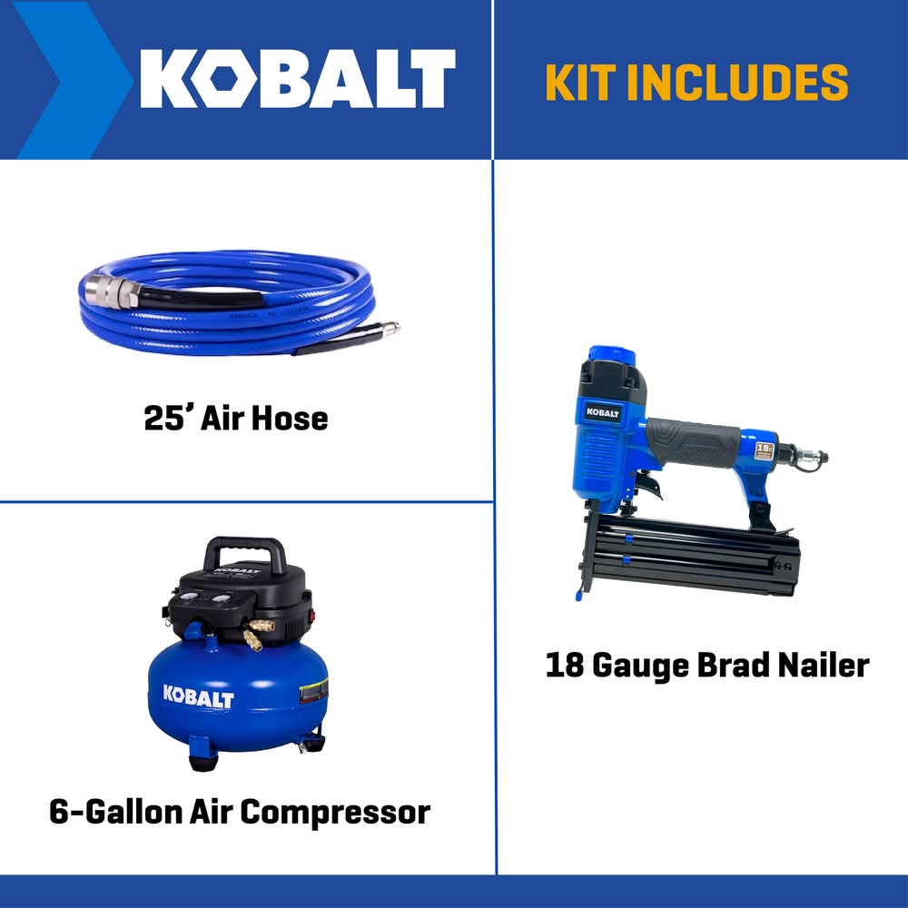 Powerful oil-free universal maintenance-free motor and easy to start in low voltage with an extension cord.. Includes: 6-Gallon Air Compressor, 18 Gauge Brad Nailer and 25’ Air Hose.. Two gauges provide pressure indicators for both tank and tool to be used. For CA Residents Only: WARNING: This product can expose you to chemicals including Lead which are known to the State of California to cause cancer and birth defects or other reproductive harm. For more information go to www.P65Warnings.ca.gov.
