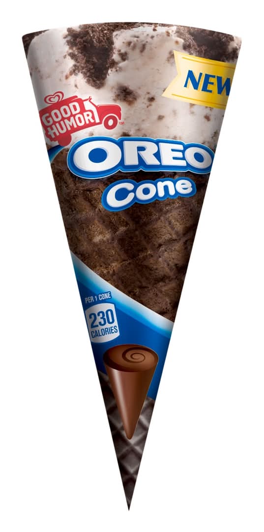 Three textures in one tasty treat: a crispy chocolatey cone, luscious vanilla, and crumbled Cookies and Creme cookie pieces. The biggest Cookies and Creme ice cream cone ever.