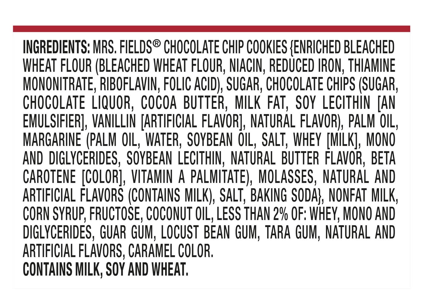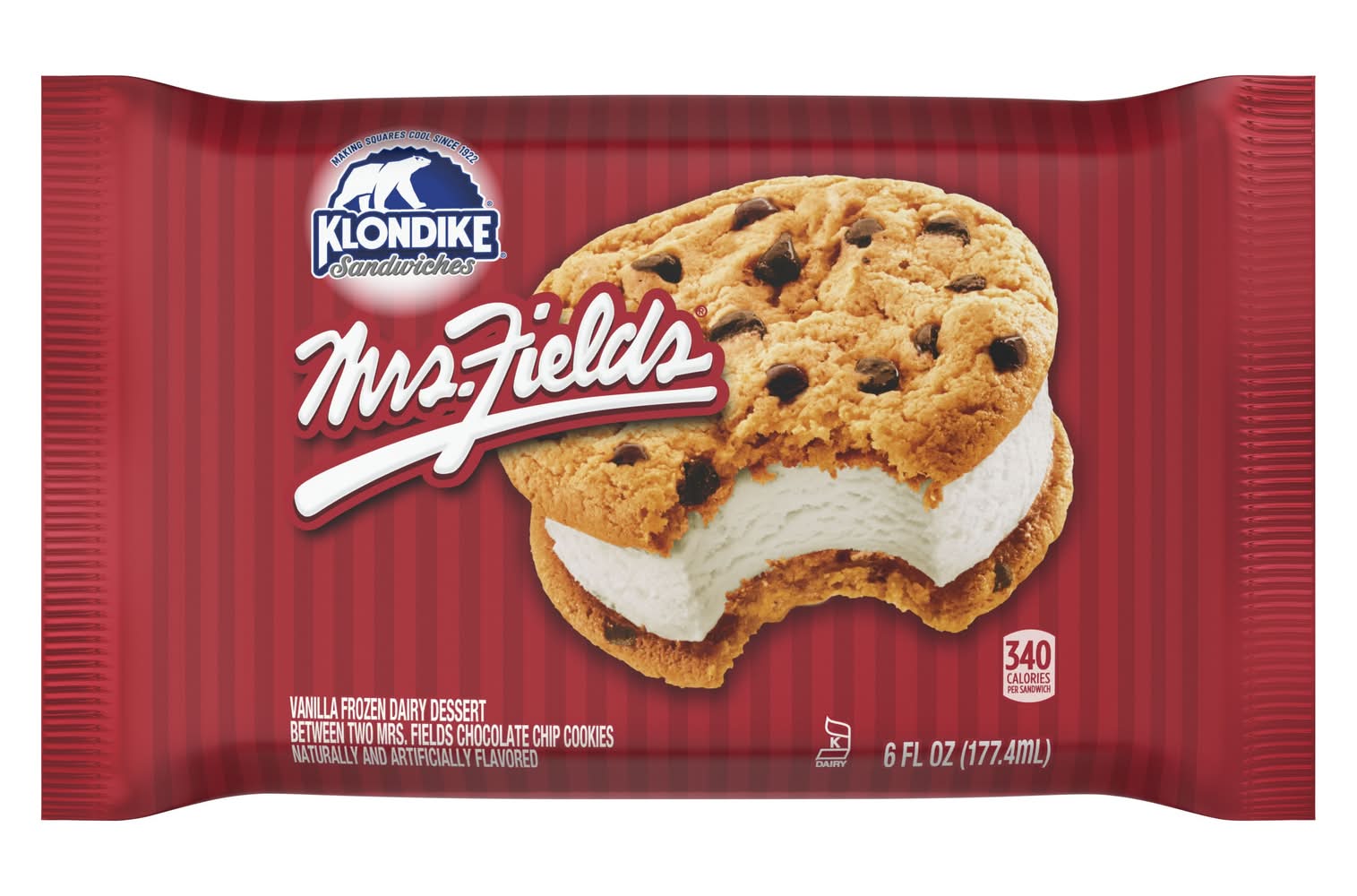 Enjoy a hearty portion of velvety vanilla favor between two delicious chocolate chip cookies with the Klondike Mrs; Fields frozen dessert sandwich. Light creamy vanilla between two Mrs; Fields chocolate chip cookies for a delicious frozen dairy dessert. Mrs Fields frozen dessert sandwiches are Kosher Certified frozen treat and made with no artificial growth hormones used on cows. Each Mrs Fields frozen dessert sandwich is individually wrapped for an easy dessert that you can eat on-the-go. This easy dessert is sold individually for an easy snack on the go; Mrs Fields frozen dessert sandwich is available in multipack too. This chocolate chip frozen dessert sandwich is perfect as a hearty snack, mid-day work break, or a simple dessert for any occasion.
