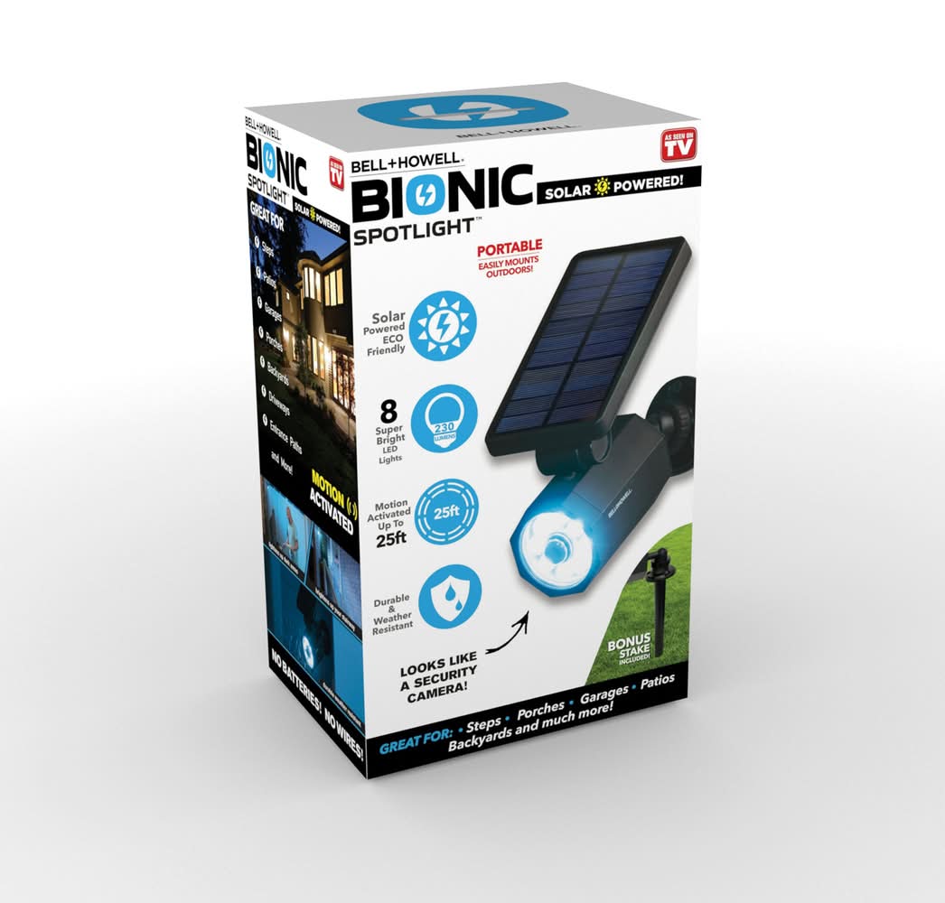 Solar powered with industrial quality sun panels. Easy installation, no batteries needed, no messy electrical wiring. Motion sensing – detects movement from 25 feet away - turns on automatically and shuts off 30-seconds after leaving vicinity of sensor range. Each bionic spotlight comes with 8 high-powered LED bulbs. Brightness coverage of 600 square feet. Weather proof - all-weather, all-season; rain, frost, and snow resistant; ideal both indoor, and outdoor use. Heat-resistant casing, no sun-induced warping or discoloration. Color: 6500