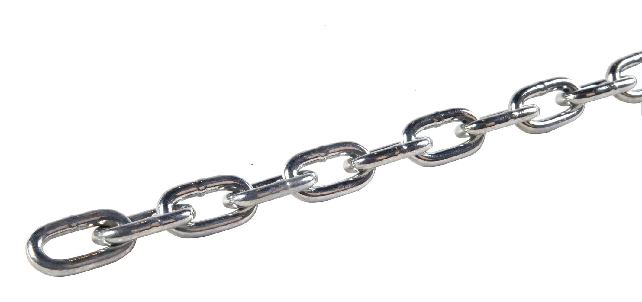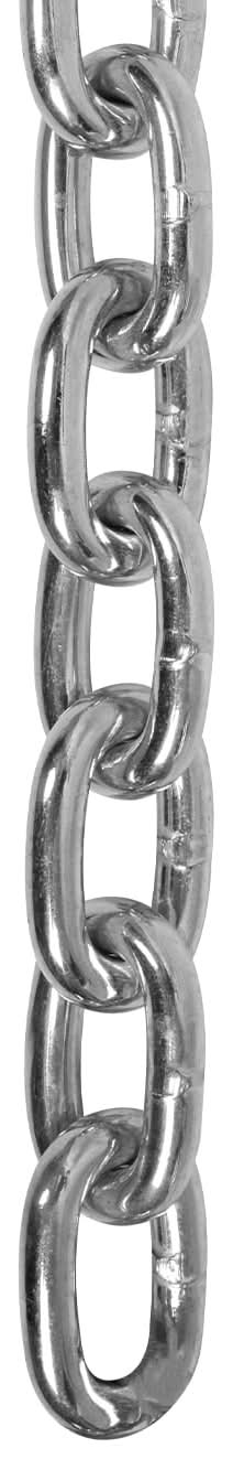 Bright zinc plated finish provides corrosion and abrasion resistance. Proof coil chain is ideal for guard and barrier, animal tie-out, tailgate, farm equipments, lashing cargo, tie down and other general indoor and outdoor purpose requiring high strength. Safe working load 2650lbs(1200kg), max breaking strength 10600lbs(4800kg). With bright zinc plated finish providing corrosion and abrasion resistance, is ideal for guard and barrier, animal tie-out, tailgate, farm equipments, lashing cargo, tie down and other general indoor and outdoor purpose requiring high strength. 3/8in chain sold by the foot for a maximum of 30 feet per pail. Warning: do not use for overhead lifting; do not exceed safe working load. Color: Silver