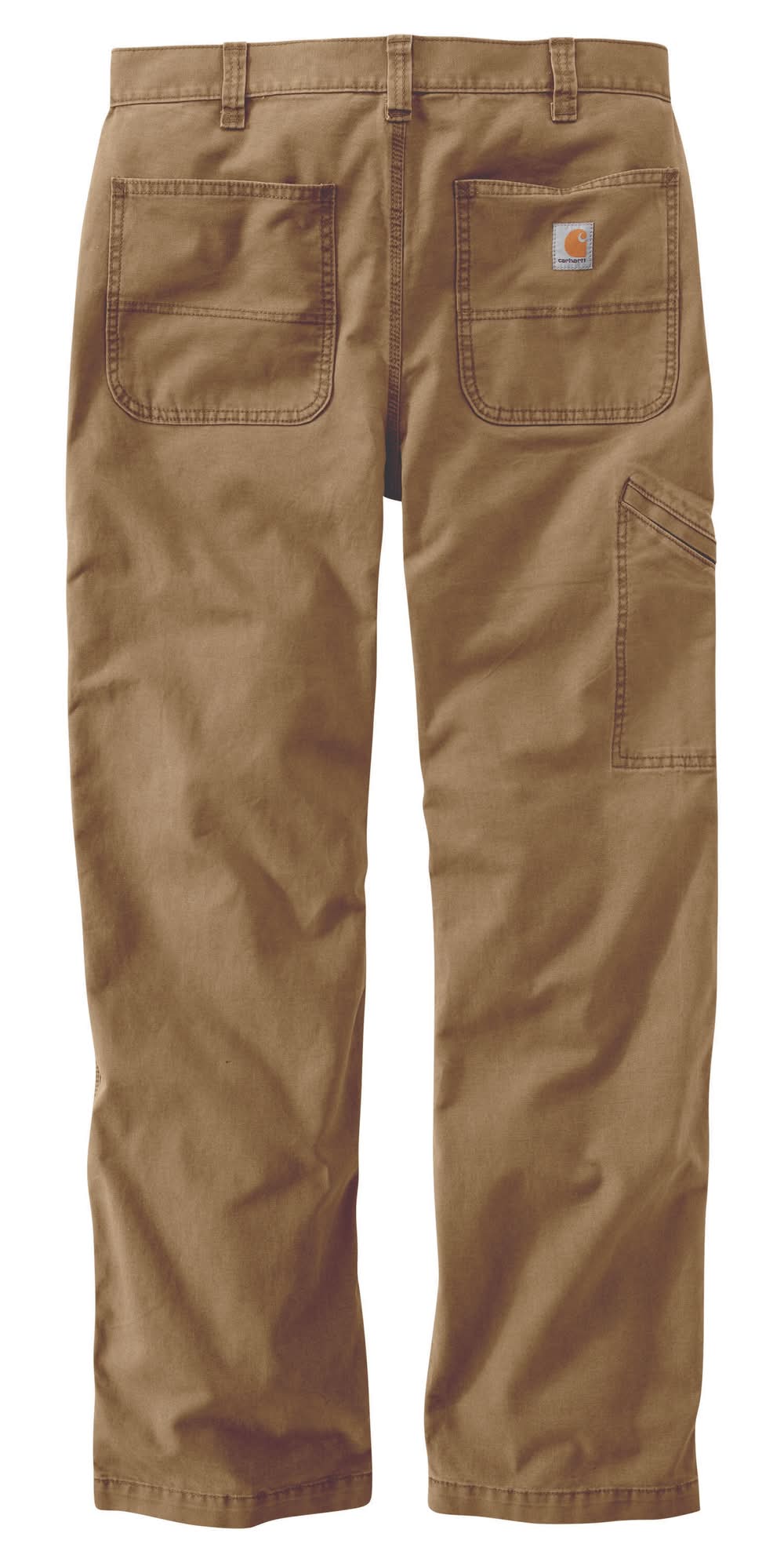 8.5-ounce, 98% cotton/2% spandex canvas with Rugged Flex durable stretch technology for ease of movement. Sits slightly below the waist with a comfortable fit through the seat and thigh with more room to move. Reinforced front slash pocket. Color: Brown
