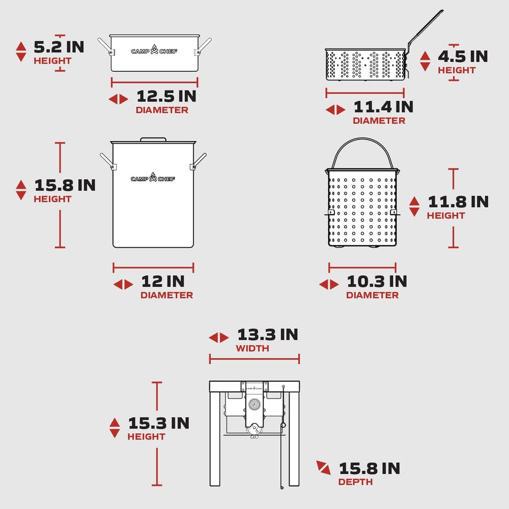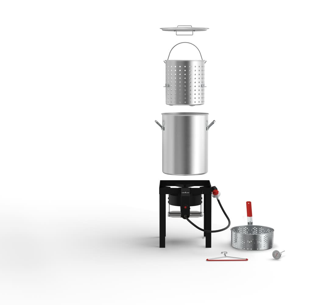 30-qt boil pot and basket, 10-qt fry pot and basket, carry-hook, and thermometer, included with single high output 50,000 BTU/hour single burner. Electric push-button ignition for easy start-up. Assembly required: select professional assembly to receive an assembled grill, if no option for professional assembly available, item will arrive unassembled. Conveniently store the lid on the pot's side handle. Twist to drain: lift strainer up and twist to set it down onto interior ledges. Overall dimensions (stand with pot): 15.8-in W x 15..8-in D x 30.8-in H. Propane sold separately. For outdoor use only. WARNING: This device cannot be used for frying turkeys. Color: Black