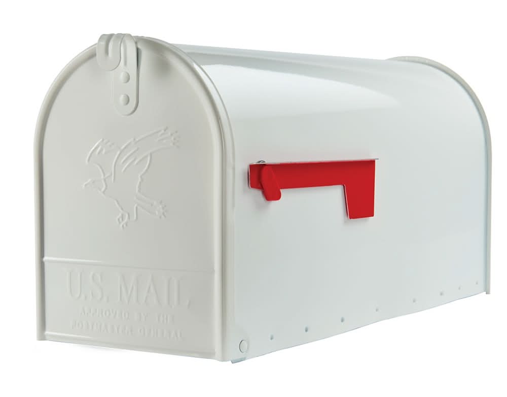 Constructed from rust-resistant galvanized steel for durability. Large capacity accommodates high volume mail deliveries including padded envelopes, magazines, and small- to medium-sized packages. Adjustable door latch can be modified for a tighter grip. Aluminum outgoing mail flag included. Glossy white finish is powder-coated to resist rust and elements. Fully assembled with pre-drilled holes on side and bottom to reduce installation time. Match with Architectural Mailboxes posts with the designation letter B. Mounting hardware sold separately. For CA Residents Only: WARNING: This product can expose you to chemicals including Lead which are known to the State of California to cause cancer and birth defects or other reproductive harm. For more information go to www.P65Warnings.ca.gov. Color: White