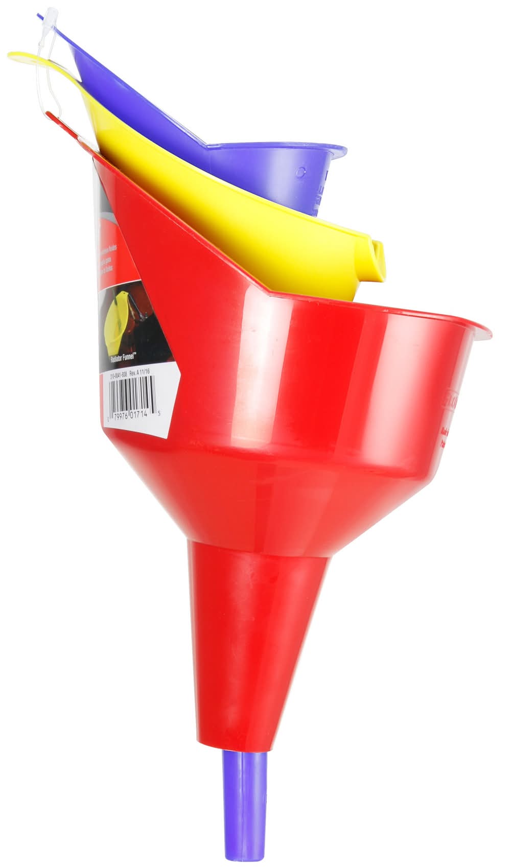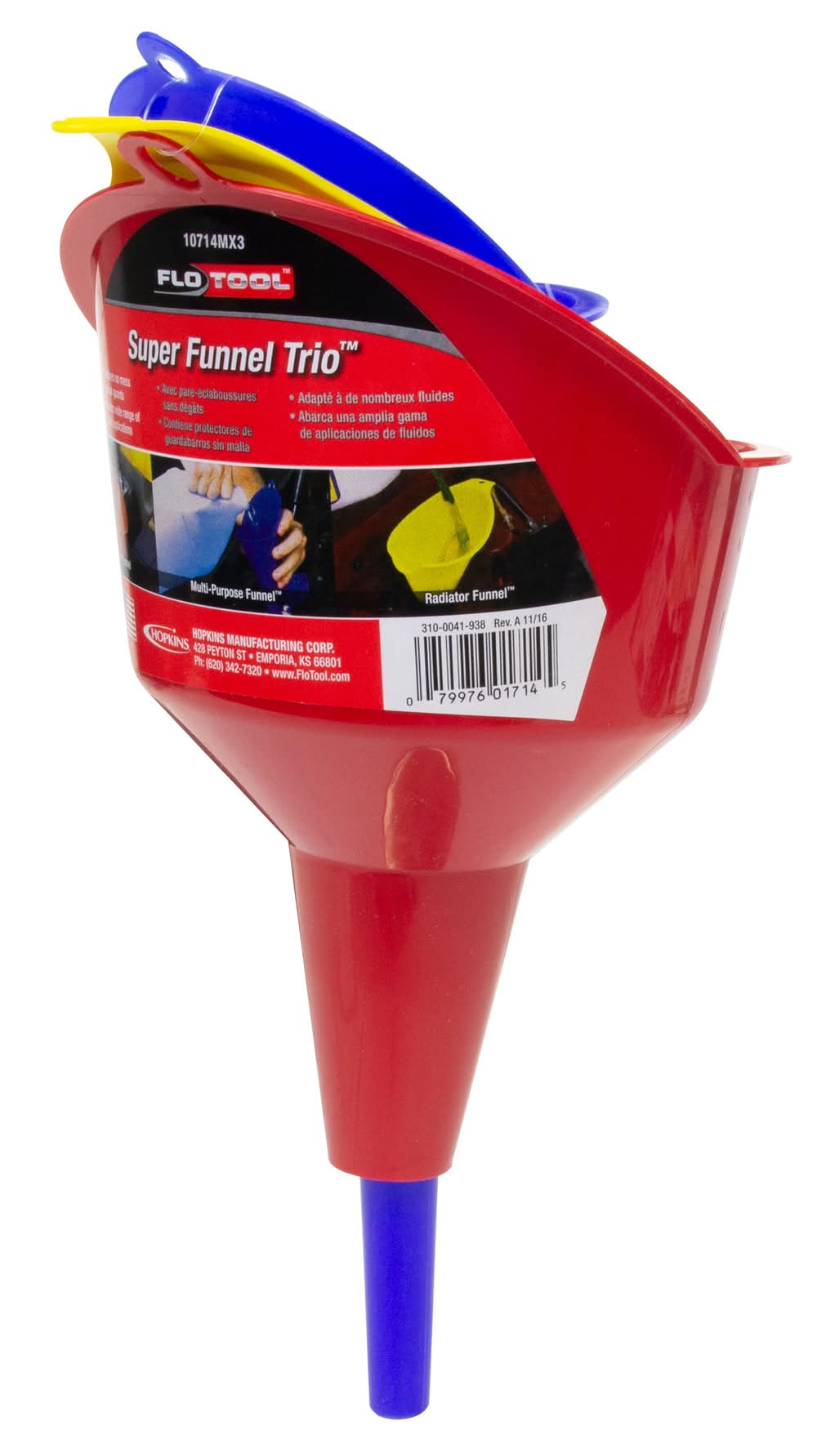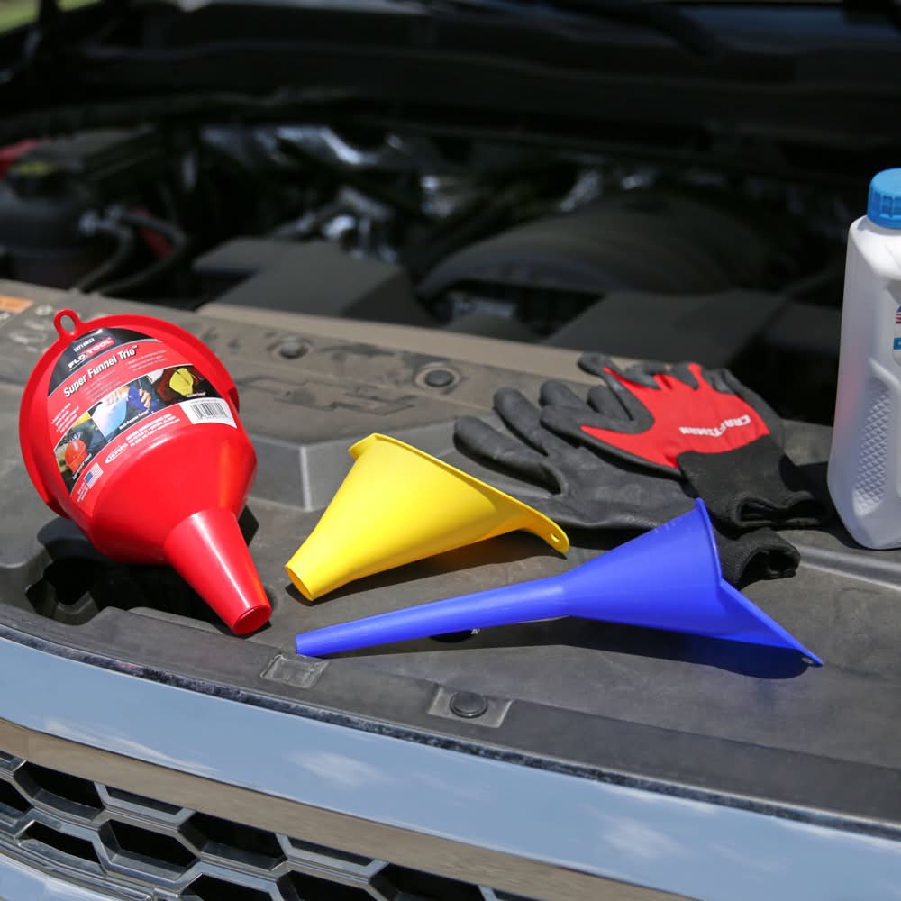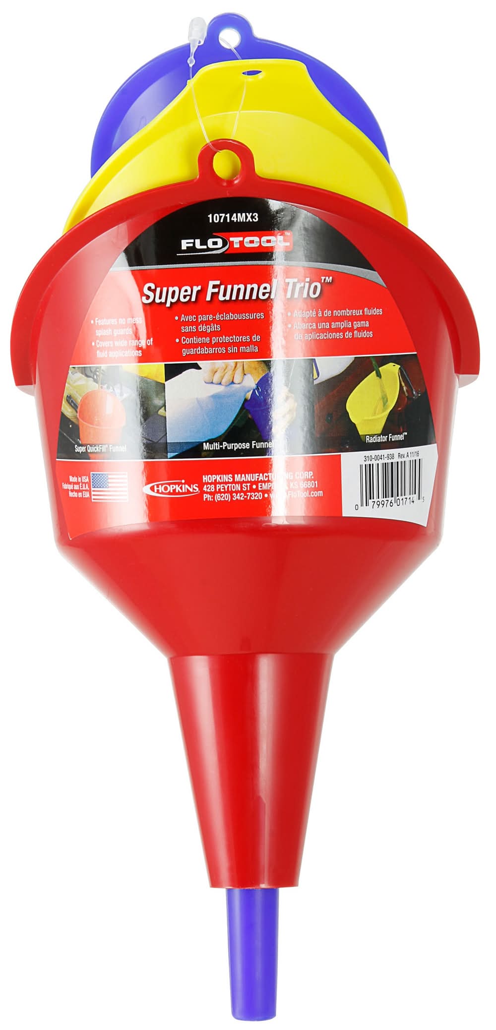Exact fit for your full-size truck, SUV or CUV using easy-trim cut lines. Prevents fluid cross contamination. Spouts that fits all size of filler tubes. Super Quick-Fix®, multi purpose, and radiator funnel combo.