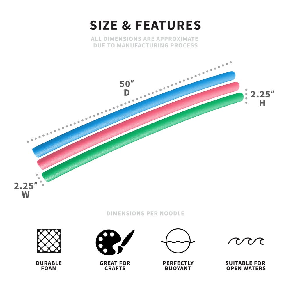Big Joe Super Swim Noodle 3-in diameter foam swim noodle in a variety of bright colors. Package includes 1 pool noodle suitable for pools, lakes, and open water. Made with solid and long-lasting buoyant foam for comfortable flotation. Sized 3-in diameter x 50-in long for excellent support. Easy to handle and super lightweight at only 0.35-lbs. Versatile foam noodles can be used for swim training, pool relaxation, activities, parties, crafts, and more. Lowe's will choose one random cheerful, color of blue, green, or pink to ship to you. Recommended for children ages 5 and up. Designed and made in the USA. Color: Multiple colors/finishes