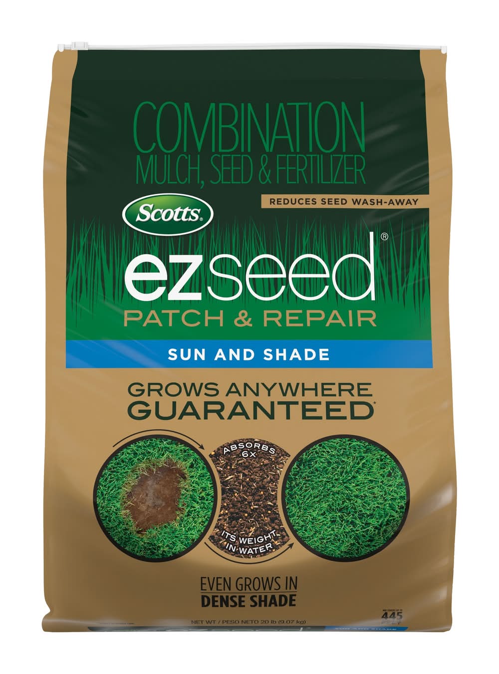 Patch and Repair: Scotts® EZ Seed® Patch & Repair Sun and Shade is a revolutionary grass seeding product designed to fill in bare spots and repair lawn damage. Sun and Shade Grass: Contains a combination of high performance grass seed, mulch that expands to surround the seed, controlled release fertilizer, tackifier to help keep seed from washing away and a protectant to help keep seedlings safe. Usage: This sun and shade grass seed mix is guaranteed to grow anywhere with proper care including in full sun, dense shade, high traffic areas and on slopes. Application: Grass seed germinates best when daytime temperatures are between 60°F and 80°F with no danger of frost. EZ Seed® Patch & Repair Sun and Shade contains a combination of mulch, grass seed, and fertilizer to cover up to 445 sq ft in 3 easy steps. Insect Resistance: None Drought Tolerance: Medium Traffic Tolerance: High