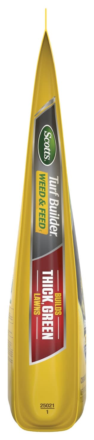 Scotts® Turf Builder® Weed & Feed5 weed killer plus fertilizer kills existing listed weeds and feeds to thicken grass and crowd out future weeds. Weed Control and Lawn Fertilizer: controls over 50 listed lawn weeds, including clover, dandelion, plantain, morningglory, chicory, eveningprimrose, and purslane. Weed and Feed for Lawns: Apply this combination weed control and lawn food to a wet lawn when weeds are actively growing and daytime temperatures are consistently between 60°F and 90°F; do not apply more than 2X per year. Use on Listed Grass Types: Apply this lawn care product to Bahiagrass, Bermudagrass, Bluegrass, Centipedegrass, Fescue, Ryegrass, and Zoysiagrass (temporary discoloration may occur on some grasses). Coverage: One 11.32 lb bag of Scotts® Turf Builder® Weed & Feed5 covers 4,000 sq ft; use a Scotts® spreader for even, uniform coverage.