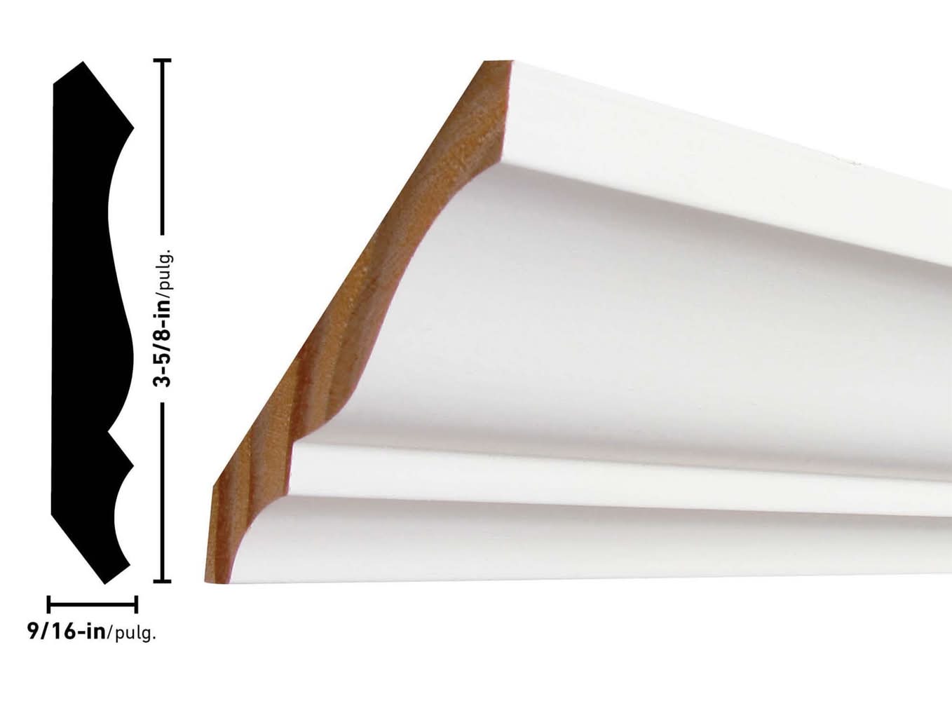 Primed crown moulding adds a stylish Colonial design to any room. Made from premium Pine for longevity and strength. Can be easily Painted to match walls and trim or create a bold accent. Designed for interior use on wall or hobby projects. Easy to install with common woodworking tools. Measures 9/16-in thick x 3-5/8-in W x 8-ft L. Ideal for interior use, so you can enhance you home and curb appeal. Use Location: Interior For CA Residents Only: WARNING: This product can expose you to chemicals including Lead which are known to the State of California to cause cancer and birth defects or other reproductive harm. For more information go to www.P65Warnings.ca.gov. Color: White