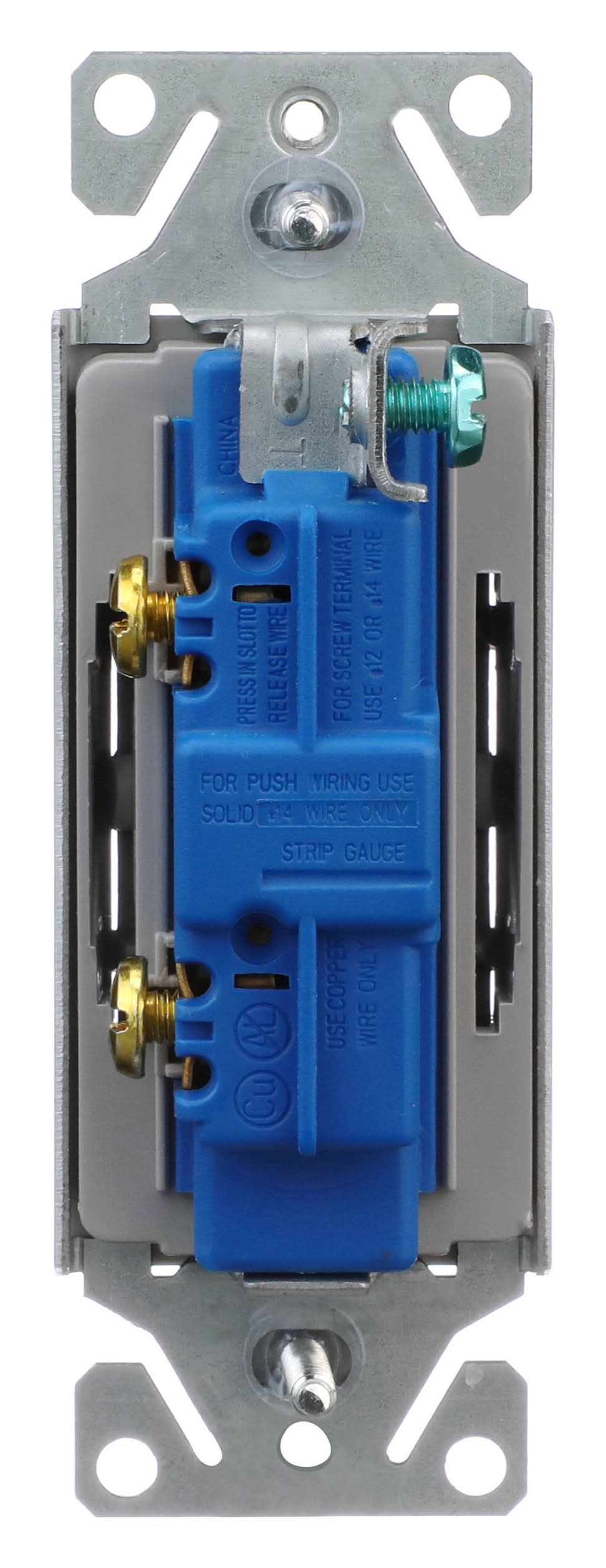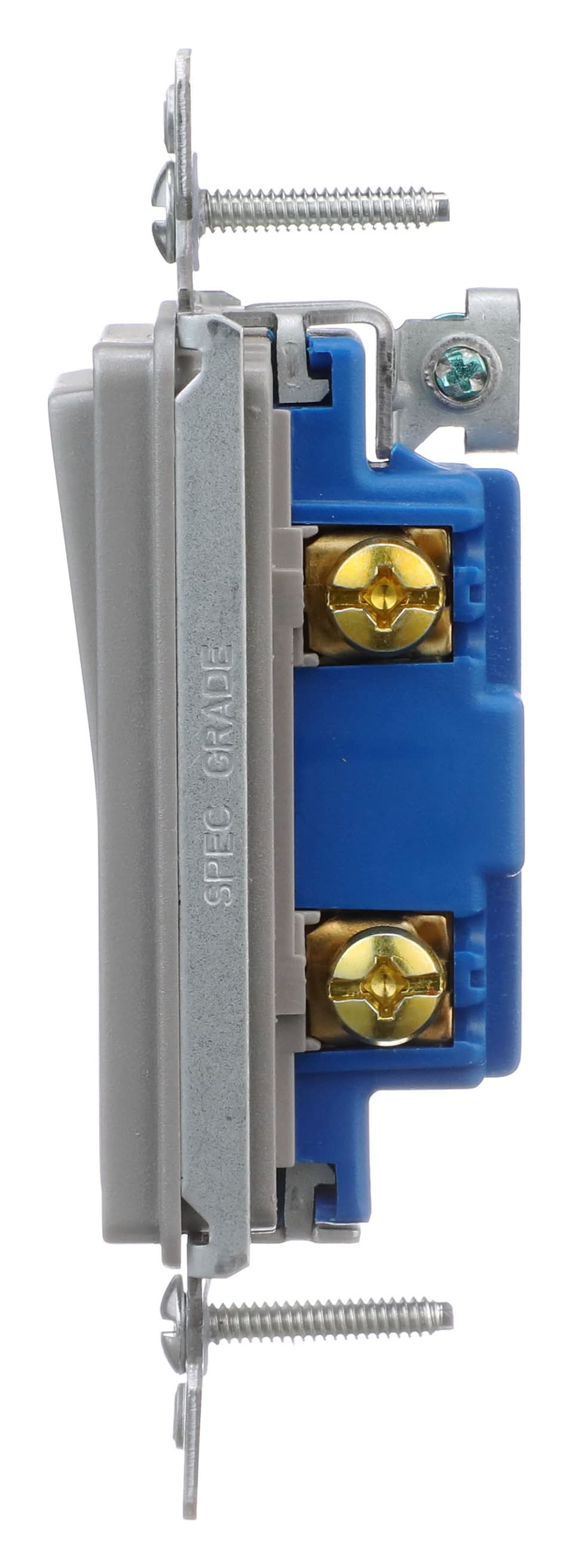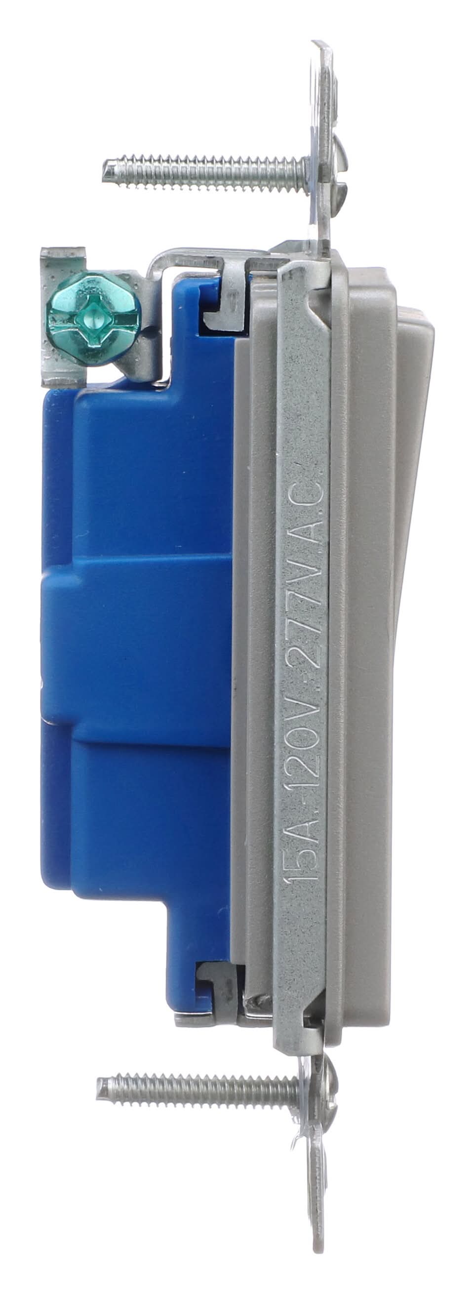 Silver granite finish single-pole decorator switch offers 15A, 120/277V capacity engineered for smooth action and years of safe, dependable performance in a variety of applications. Backwire clamps provide easy installation for #12 and #14 AWG wire, push-in terminals accept #14 AWG solid wire. Thermoplastic rocker, top, and backbody are virtually unbreakable, promising years of durable performance. Longer, wider strap provides 40% more contact area to wallboard, virtually eliminating floating installations. Ultrasonic welding and integrated construction of the strap and body provide superior structural integrity. Stippled ground screw terminal. Convenient, built-in wire strippers speeds installation. Add a full suite of metallic finished products for a contemporary look, available in dimmers, receptacles, USB receptacles, GFCIs, wallplates, and more.