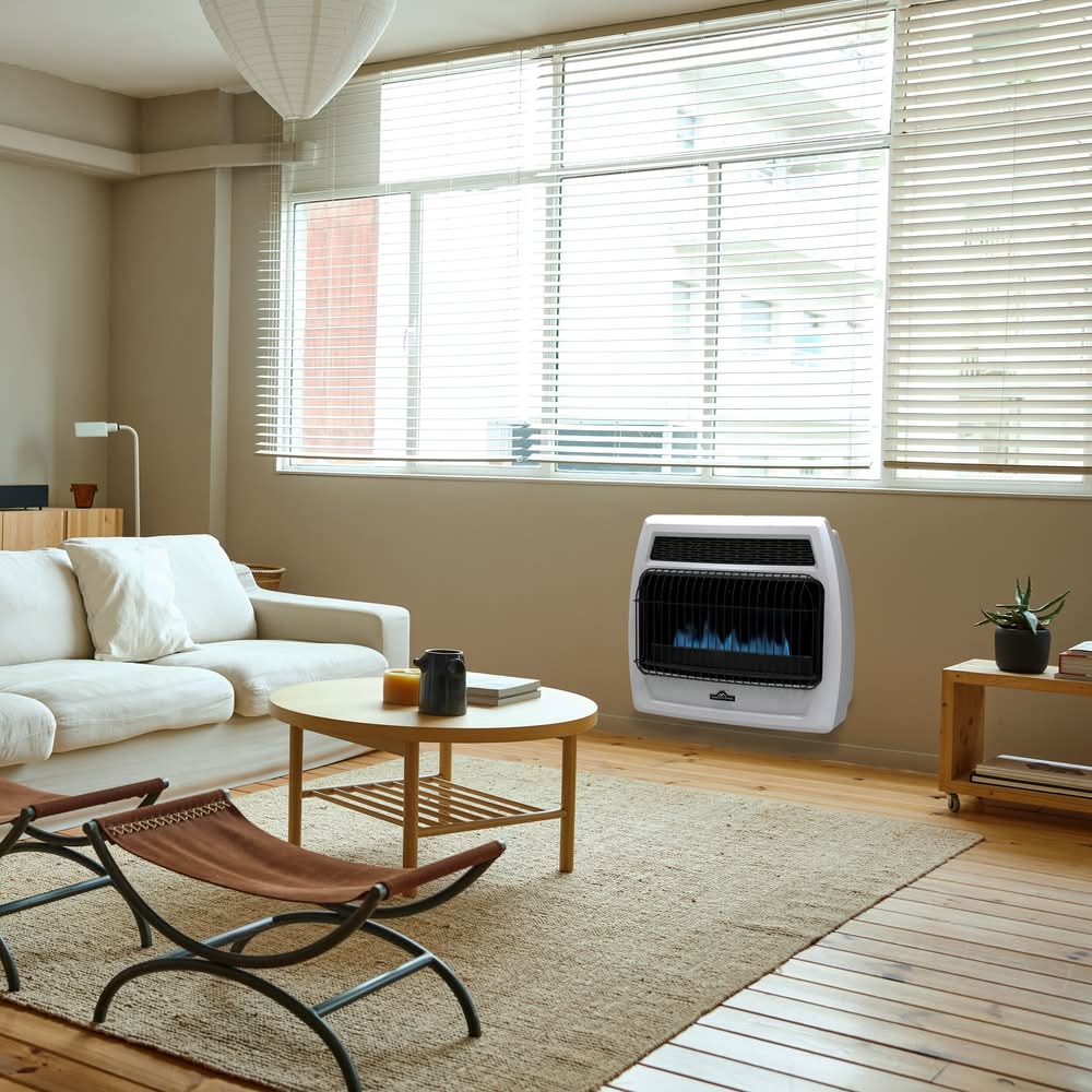 Wall-mounted indoor heater uses dual fuel technology for your choice of either liquid propane or natural gas. Heater provides up to 30,000-BTUs per hour, and warms an area up to 1,000-sq ft. Thermostat control knob automatically maintains your ideal heat level. 24.09-in H x 10.51-in D x 28.07-in W. Innovative wrong fuel shut-off prevents issues from an incorrect fuel hook-up. Propane heater does not require electricity, making it a reliable, back-up heater option. Blue flame heating technology spreads heat like a central heating system by convecting heat to warm the air. Base legs (WBL100) allows for stable floor mounting (sold separately). Quiet fan (WHF100) increases the heat radius (sold separately). Use Location: Indoor For CA Residents Only: WARNING: This product can expose you to chemicals including Lead which are known to the State of California to cause cancer and birth defects or other reproductive harm. For more information go to www.P65Warnings.ca.gov. Color: White