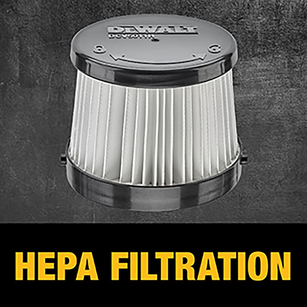 46 CFM provides higher suction performance for more efficient clean-up. 65 Air Watts with a 5.0Ah DCB205 battery pack (sold separately). 6 Accessory cleaning solutions. Drawstring accessory bag keeps vacuum accessories in one place. Easy empty canister to minimize exposure to dust and debris. HEPA Filtration allows for clean and efficient cleanup of fine dust like concrete and drywall. A bright LED light illuminates the darkest areas. The belt hook frees up hands to work more efficiently. Includes: (1) DEWALT® 20V Cordless Dry Hand Vacuum (Tool only), (1) Extension tube, (1) Flexible hose, (1) Crevice nozzle, (1) Round brush, (1) Gulper brush, (1) Floor nozzle, (1) Accessory bag. Color: Yellow