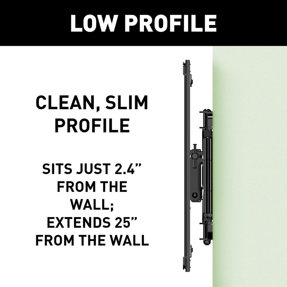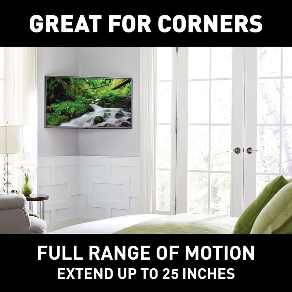 Fits TVs 42 to 90 inches, up to 120 pounds. Extends over 25 inches from the wall with up to 43 degrees of swivel (with a 75 inch TV) for perfect viewing anywhere in the room. Tilts down 15 degrees or back 5 degrees to eliminate glare and reflections. Low profile mount sits just 2.4 inches from the wall. Post-installation adjustment ensures TV is level. Perfect for mounting your TV in a corner. Safety tested and UL certified. Limited 5 year warranty. Use Location: Indoor Color: Black