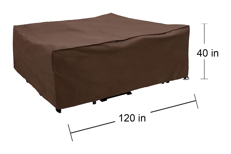 Oversized premium patio cover. Cover everything on your patio at the same time fits up to 120-in L. Cover dimensions:40-in H x 90-in W x 120-in D. Easy release buckles provide a secure fit and guards against all types of weather. Extreme water and temperature resistant. 5 year limited warranty.