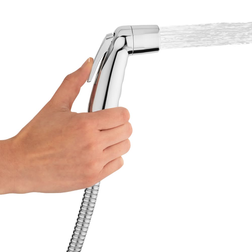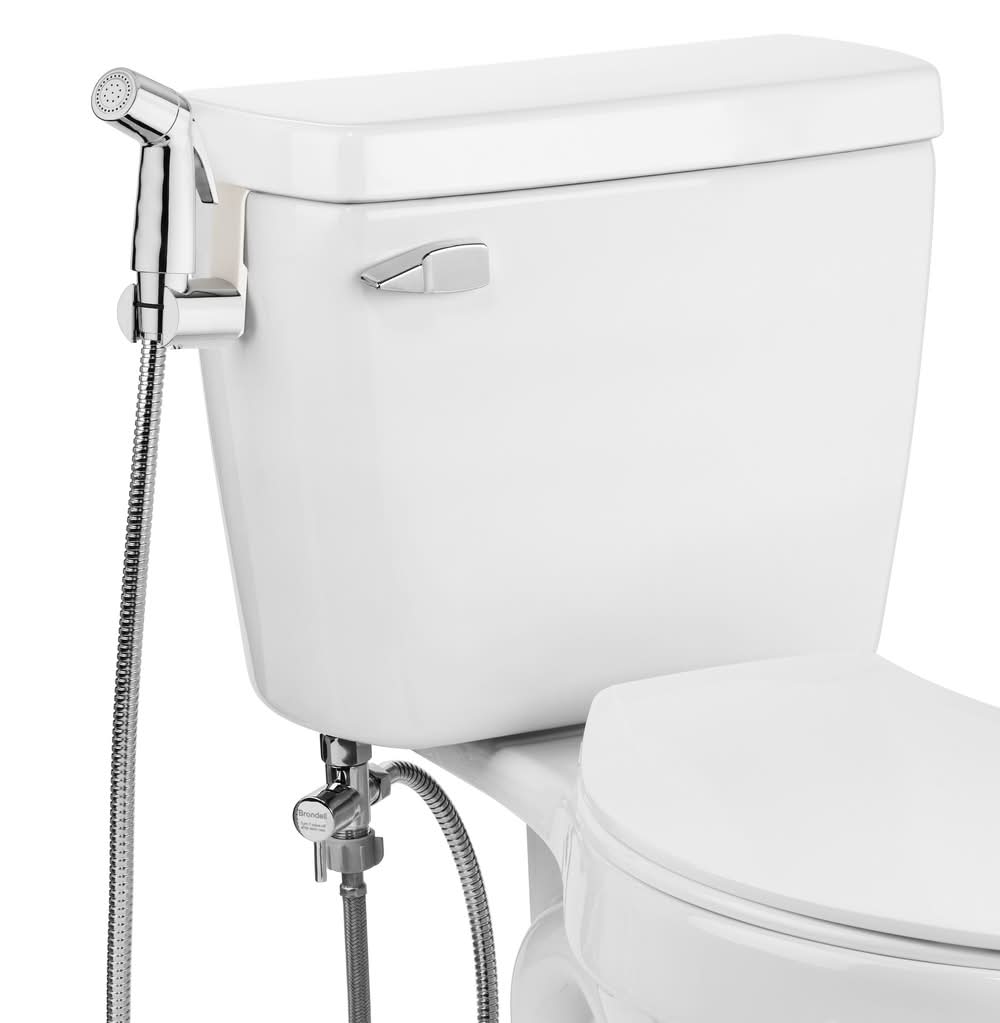 Delivers refreshing, ambient temperature wash. Spring-loaded trigger for easy water pressure control. Flexible spiral metal hose with patented inner woven core. Easy-access holster mounts to wall or toilet. Brass core 7/8” T-valve with water shutoff. Simple, DIY installation. Comes with all accessories for standard installation. Powered by water pressure alone, no batteries or electricity required. Available only at Lowe’s. Color: Chrome