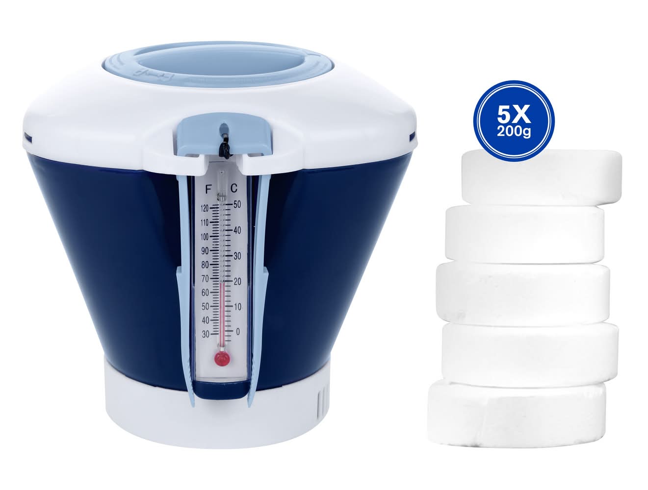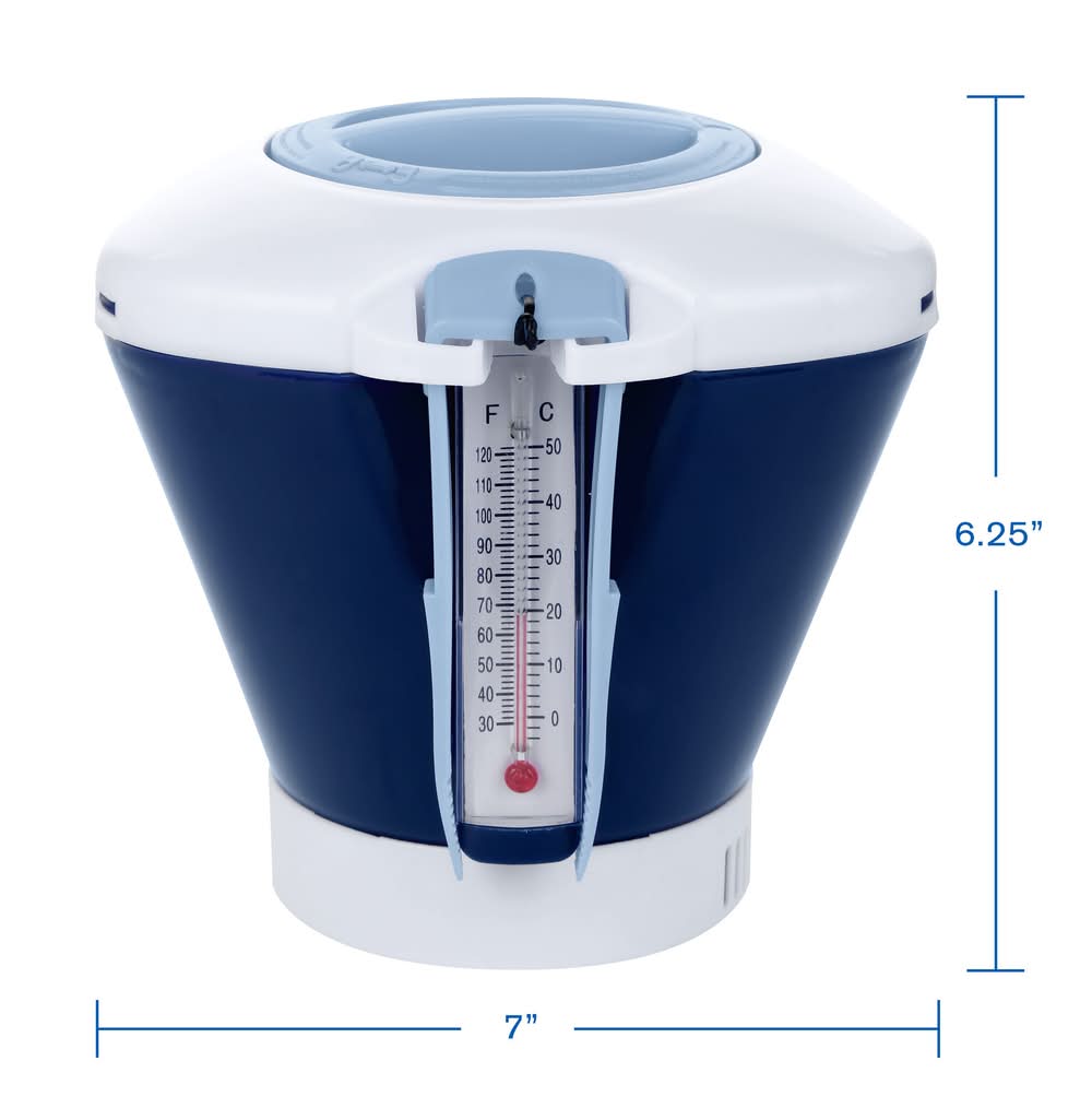 Integrated thermometer with F and C reading. Included tongs. Contains up to 5 (200g) or 1 (600g) chlorine puck. Rotating ring for chlorine flow adjustment.