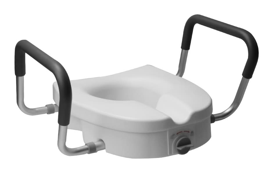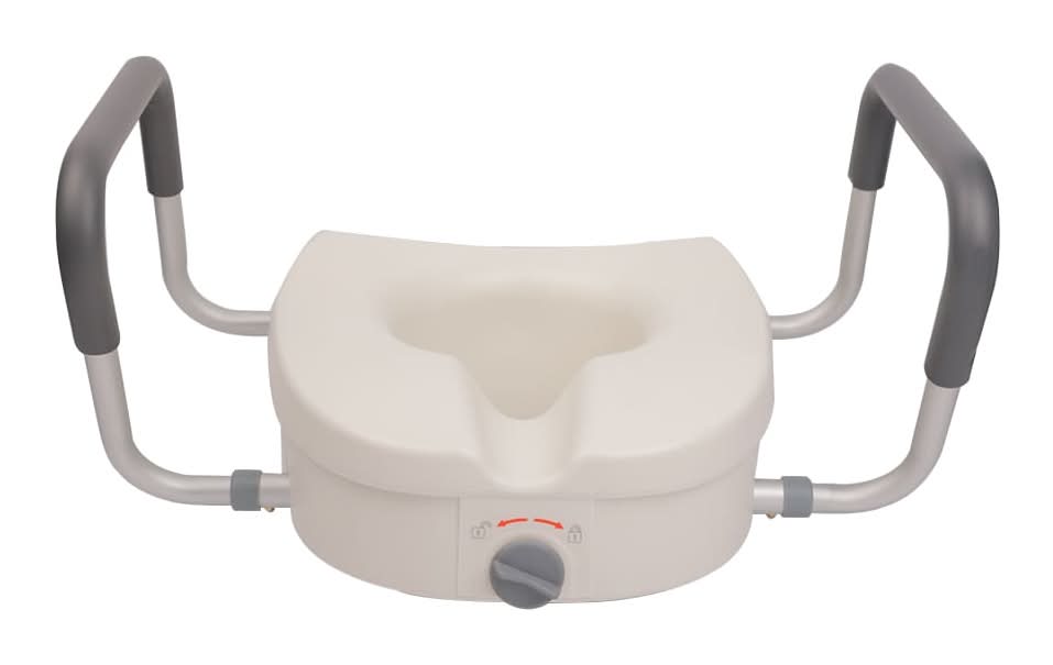 2 padded support arms make it easier and safer for the user. It helps prevent shifting of toilet seat with sitting or transferring. Wide, contoured surface provides user comfort. Elevated toilet seat with front clamping mechanism is easy locking onto toilet.