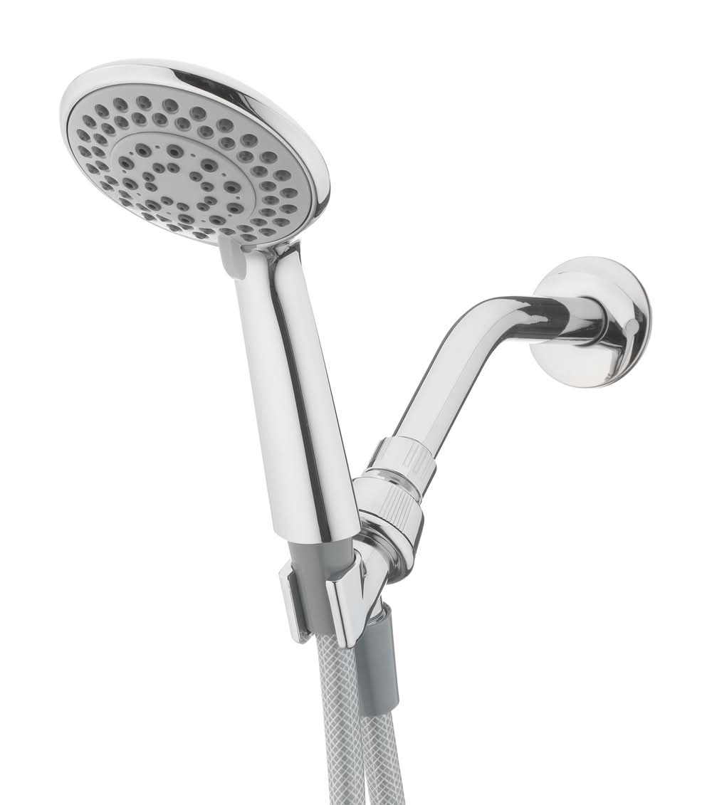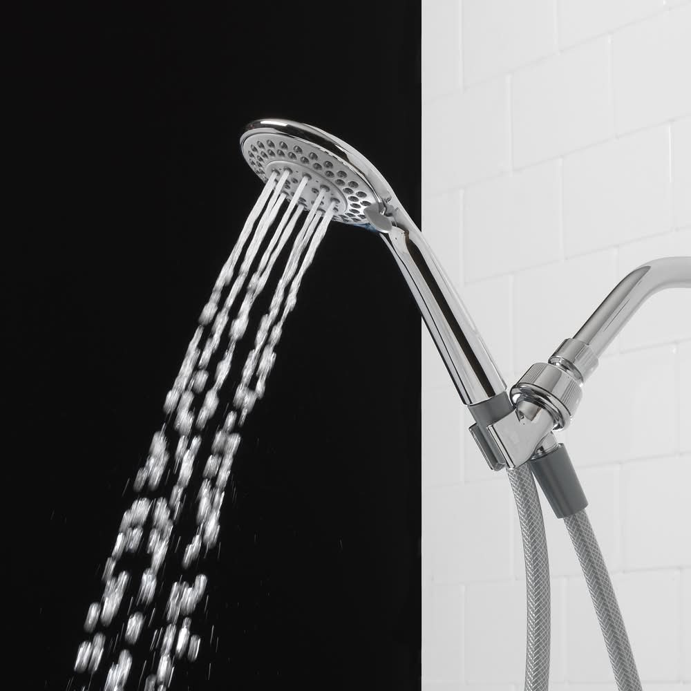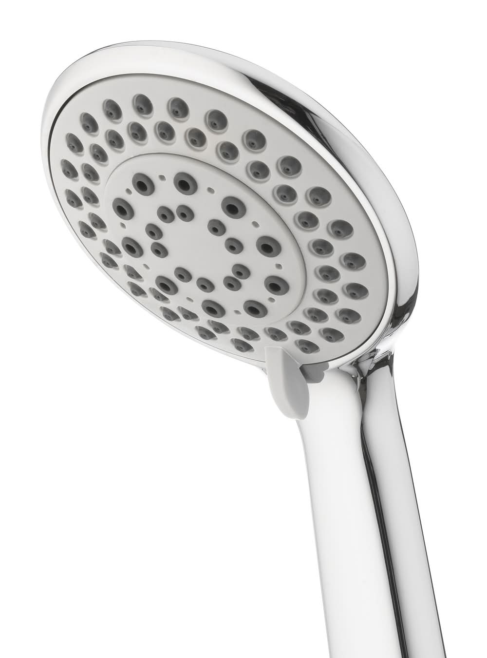 Chrome Project Source handheld shower head. Self cleaning rubber nozzles reduce clogging. 5-Spray settings provide a variety of water flow options to suit your preferences. Includes 5 spray settings. WaterSense certified maximum flow rate of 1.8 GPM (6.8 LPM). Water conserving shower massage showerhead. Easy installation. PTFE tape included. Covered by a limited lifetime warranty. For CA Residents Only: WARNING: This product can expose you to chemicals including Lead which are known to the State of California to cause cancer and birth defects or other reproductive harm. For more information go to www.P65Warnings.ca.gov.