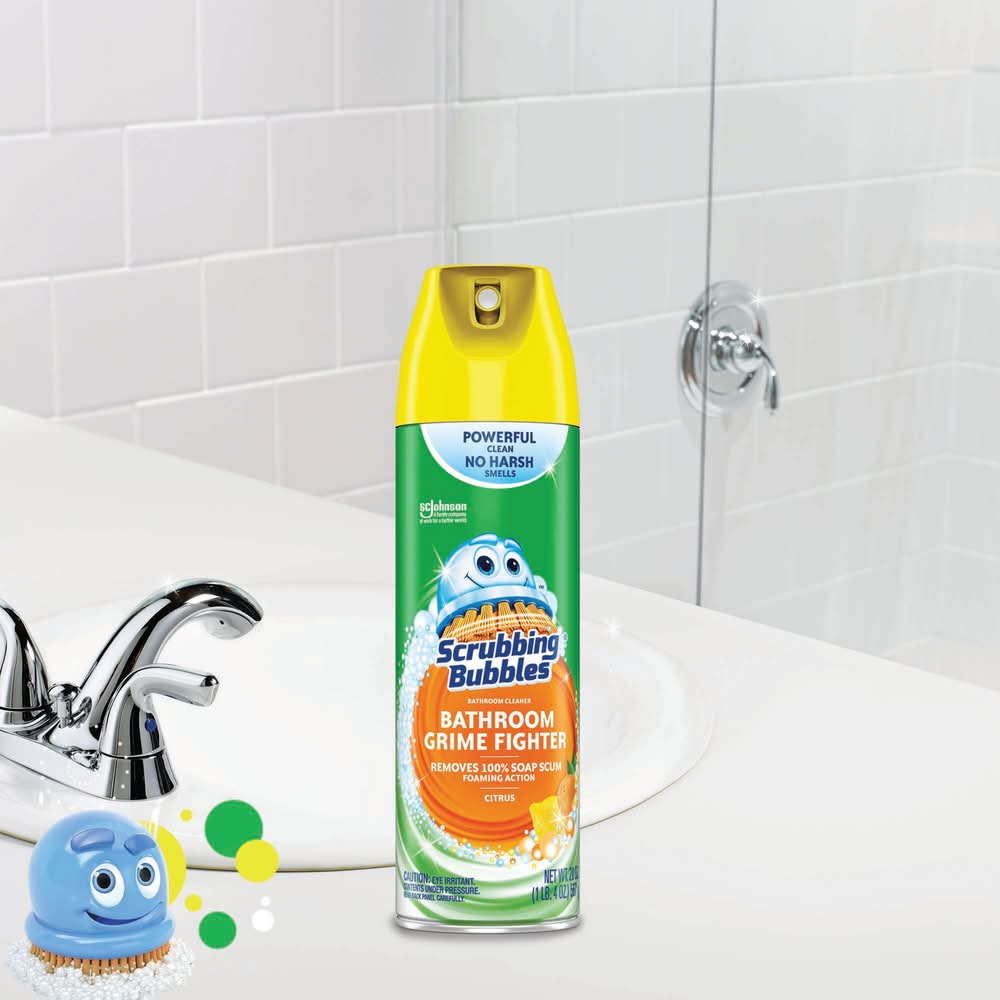 Scrubbing Bubbles Bathroom Grime Fighter Aerosol is a disinfectant cleaner with a penetrating foam that takes on grime wherever it hides and kills 99.9% of viruses^ and bacteria*. This multisurface bathtub cleaner, shower cleaner, and tile cleaner removes 100% of soap scum and smells amazing. A disinfectant spray that is effective on multiple surfaces, including glazed ceramic tile, stainless steel, chrome fixtures, fiberglass, vinyl, glazed porcelain, glass, laminate, Corian, sealed granite and quartz surfaces. All purpose bathroom cleaner that is ideal for your tile, bathtub, shower walls, vinyl shower curtains, shower doors, sinks and countertops. This disinfectant is also available in an adjustable trigger spray. Use Location: Indoor Packaging: Reusable